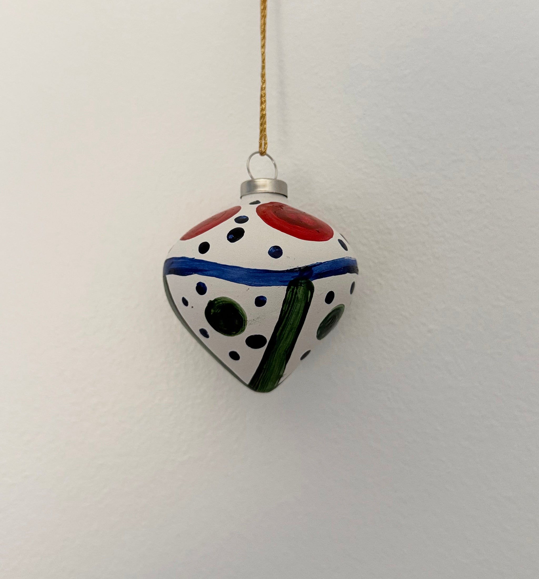 Farverig julekugle med et moderne udtryk. Unik julekugle malet i hånden i hjerteformet lertøj.
