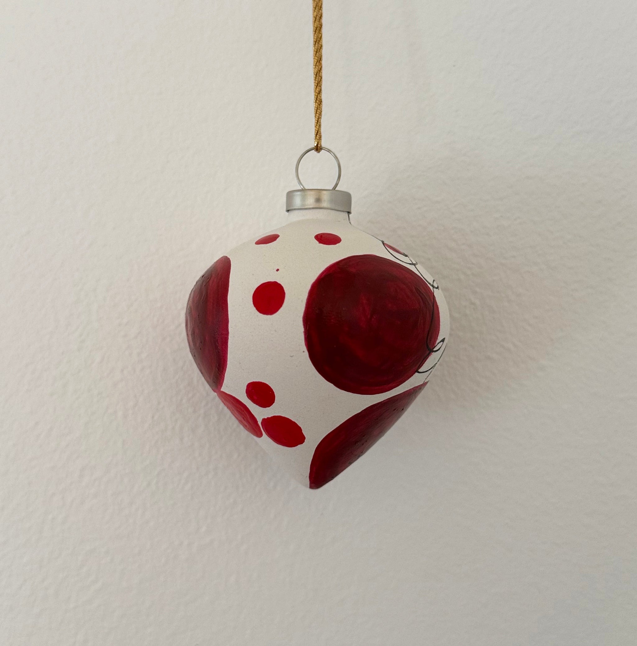 Hjerteformet julekugle i røde nuancer.