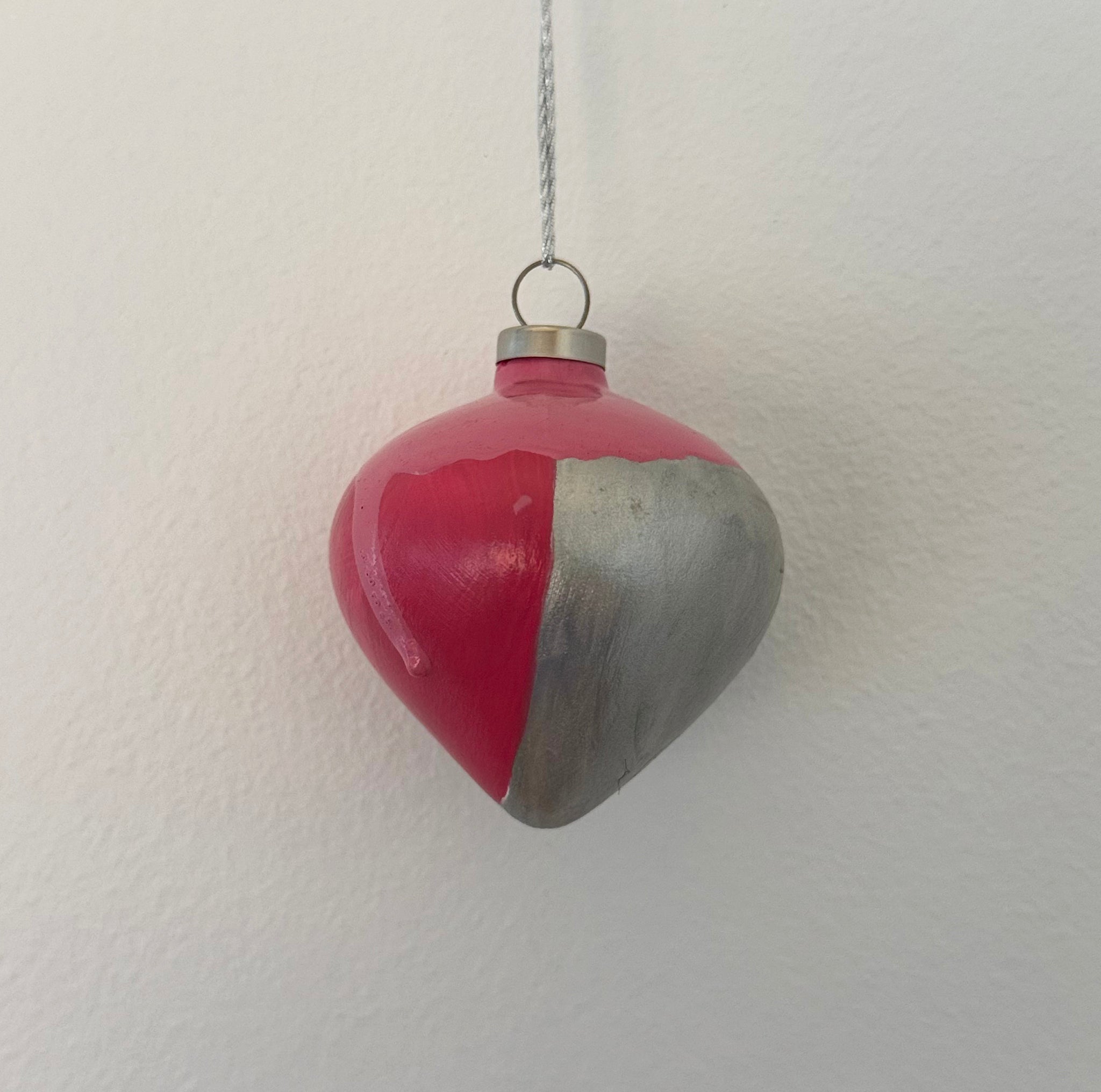 Hjerteformet julekugle i sølv og pink gør julen eventyrlig og har en moderne effekt på juletræet. Håndmalet og unikt kunstværk, der findes kun den ene.