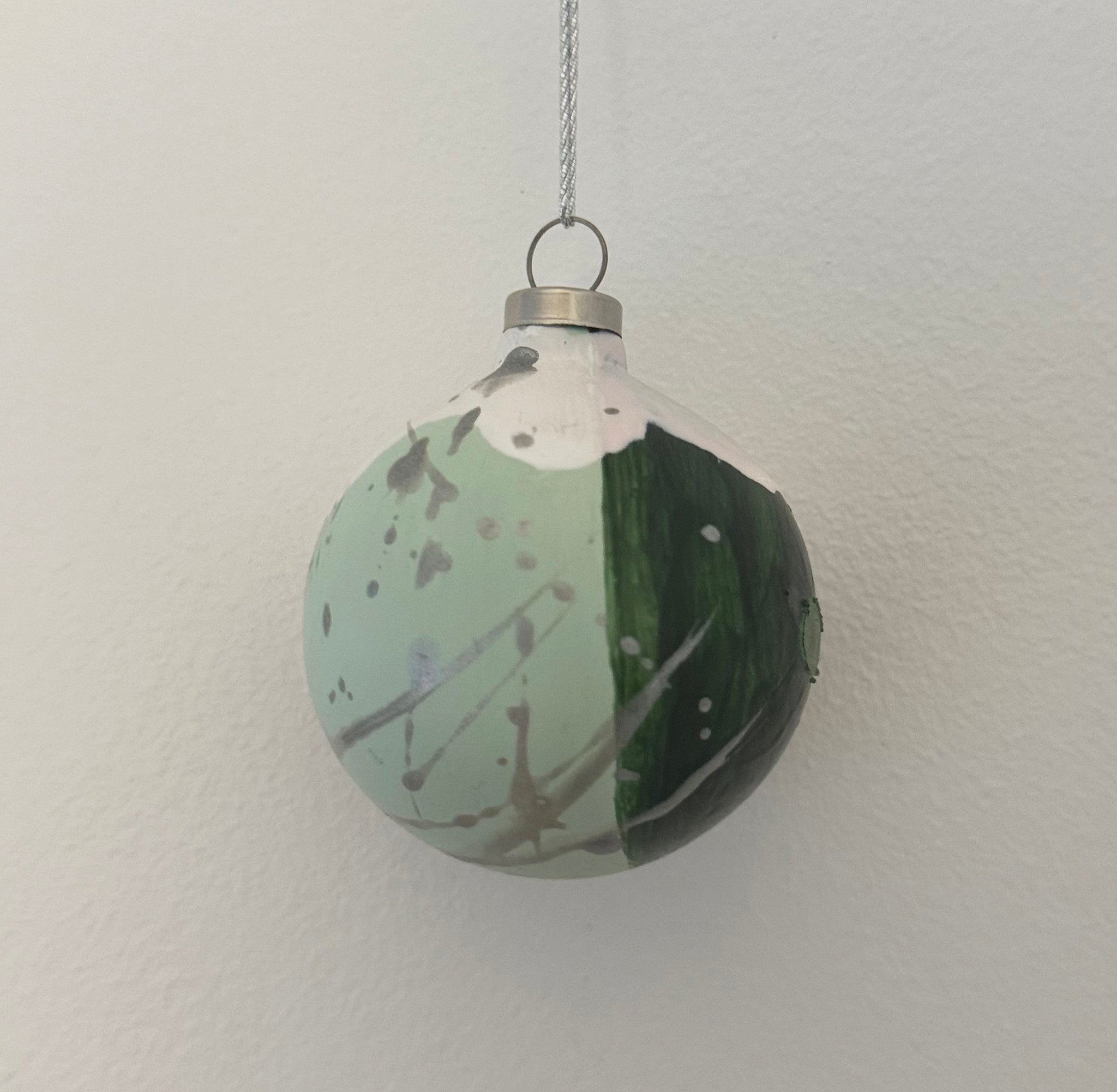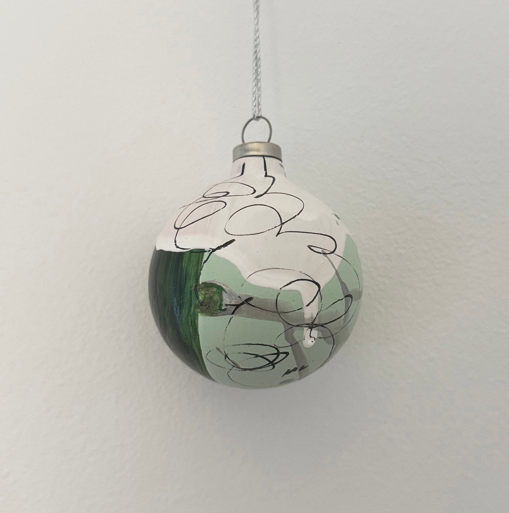 Rund julekugle i farvekombinationen grøn og sølv. Kunstværk til den moderne juleudsmykning.