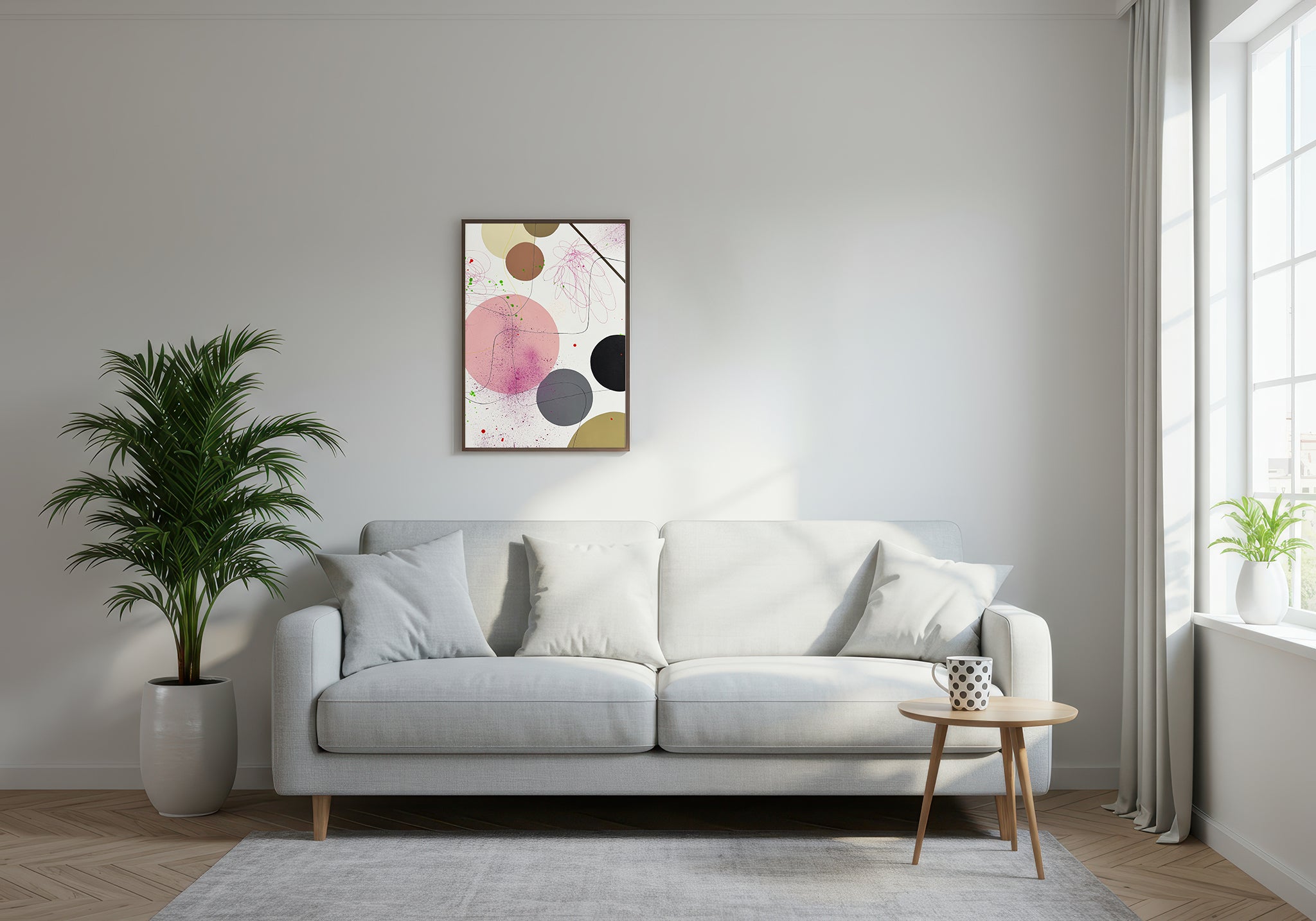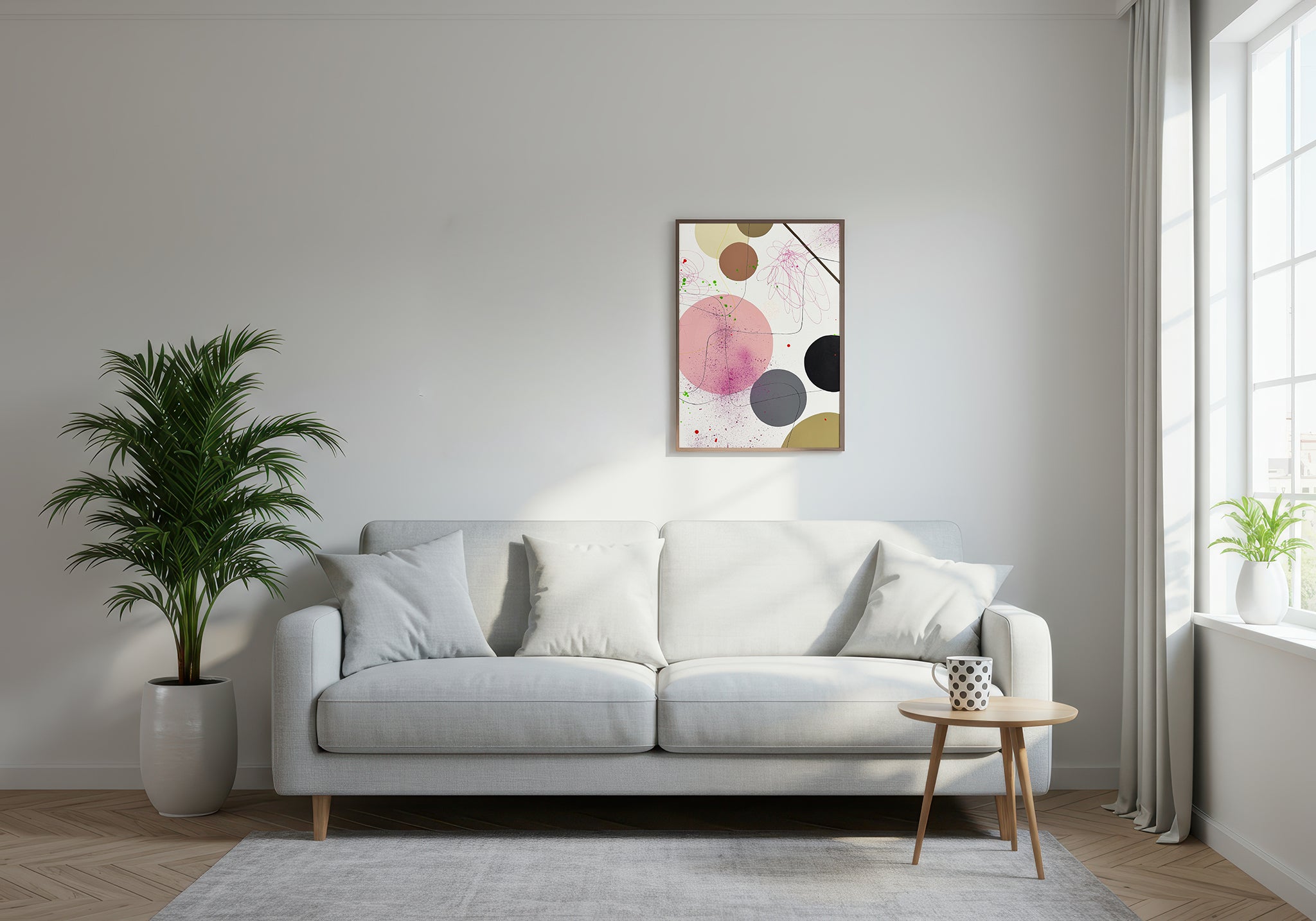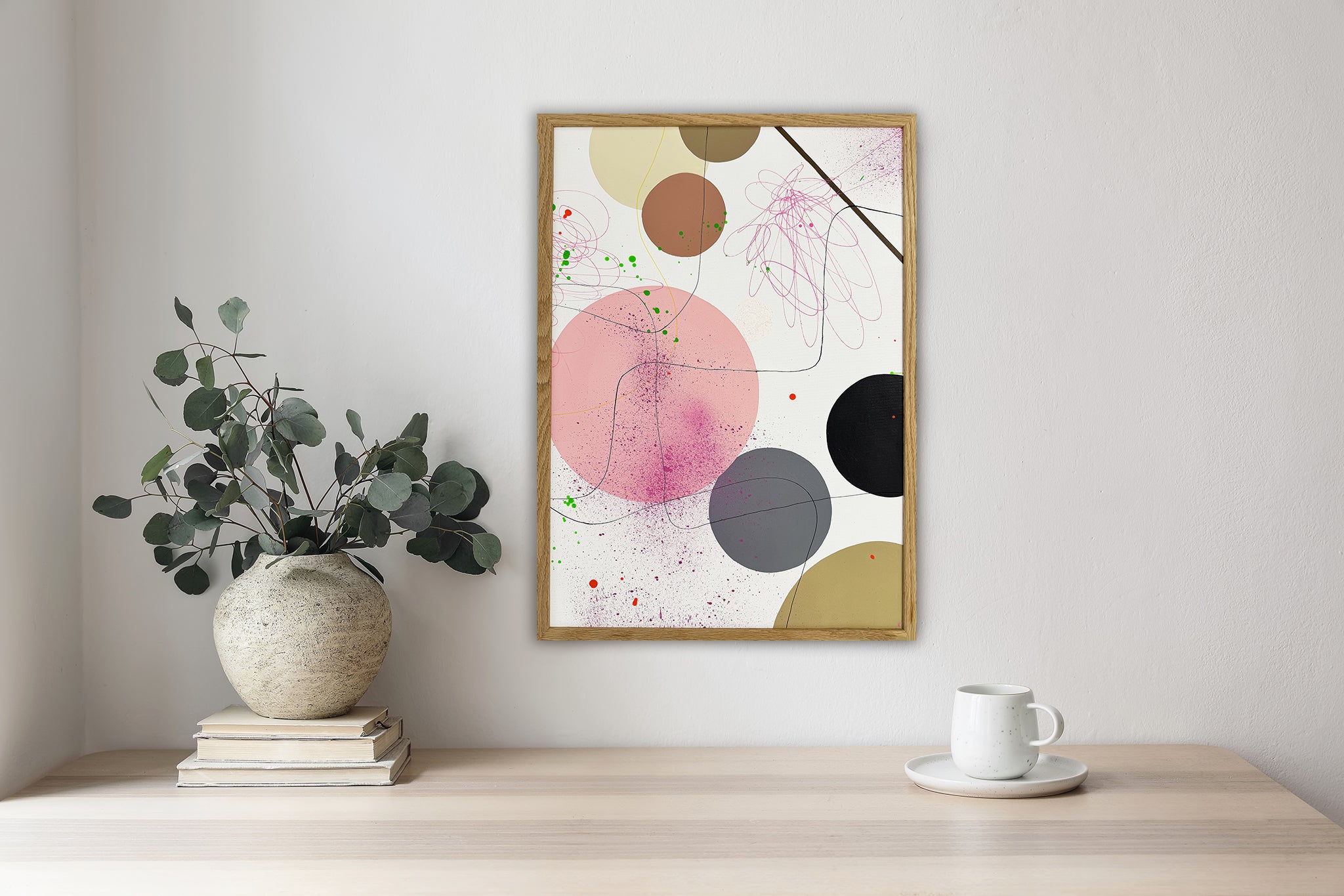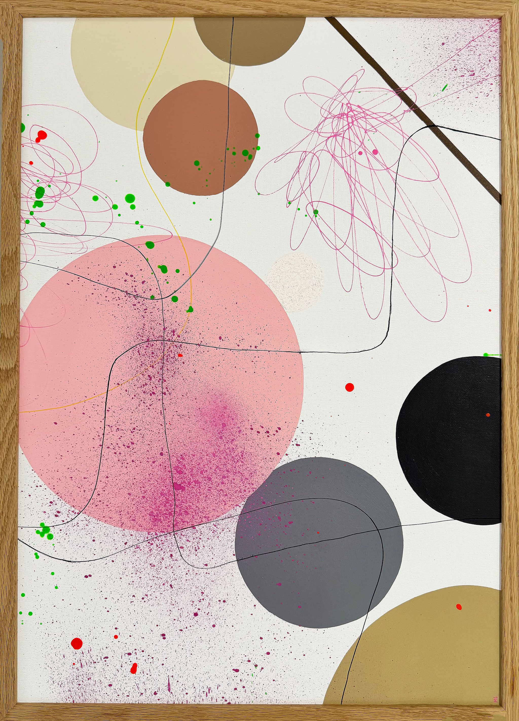 Håndmalet maleri i en elegant ramme af egefinér med glas. Stilarten er moderne og har et grafisk udtryk. Svævende bløde former skaber en poetisk stemning med nuancer, der gør maleriet levende og åben for fri fortolkning.