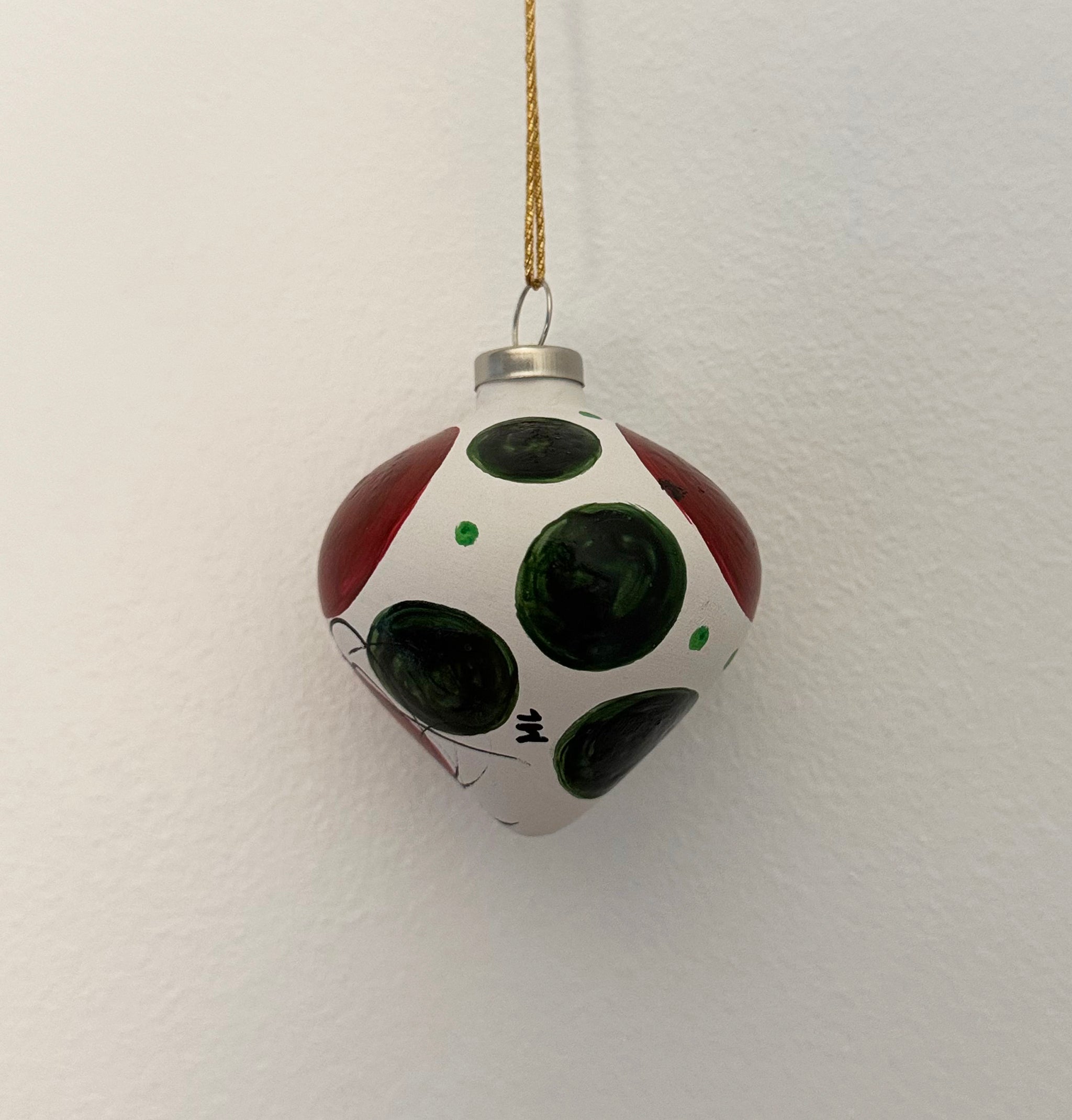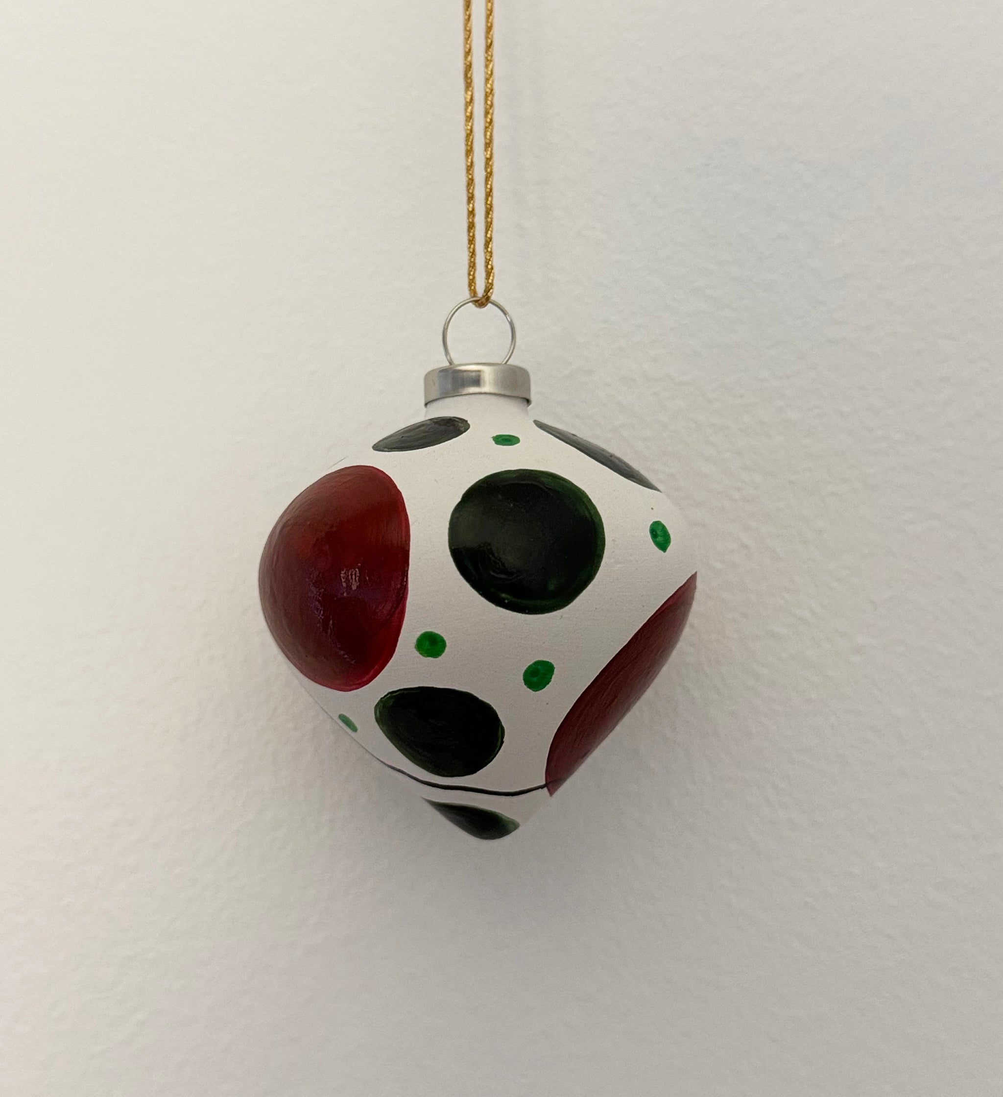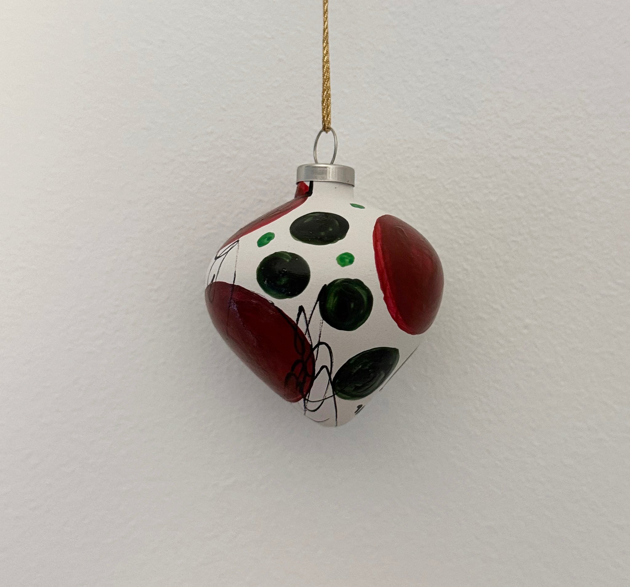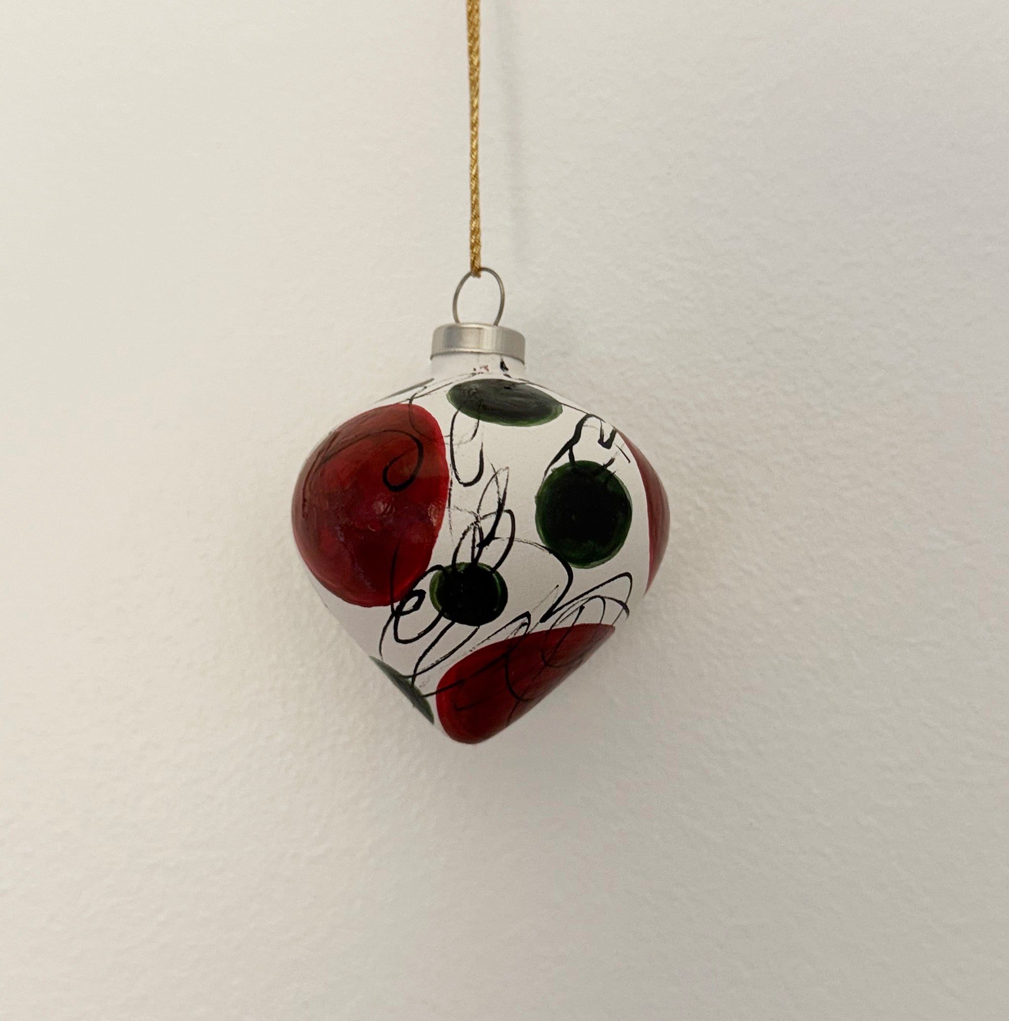 Hjerteformet julekugler i farvekombinationen dyb rød og grøn. Små unikke kunstværker til den traditionelle juleudsmykning.