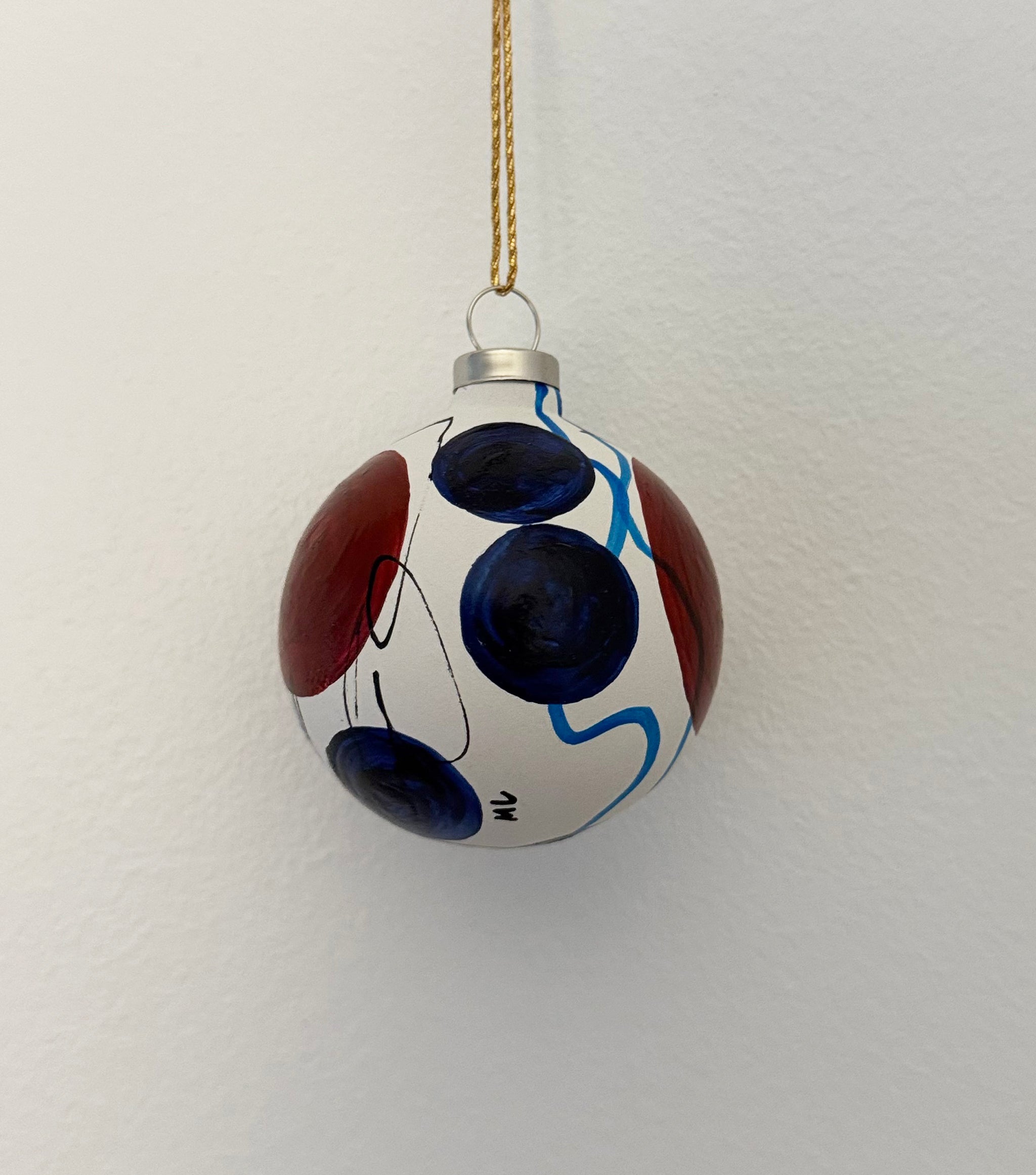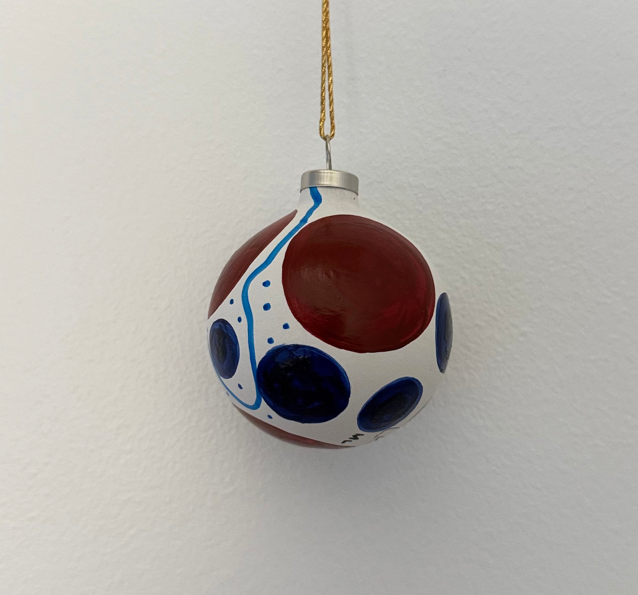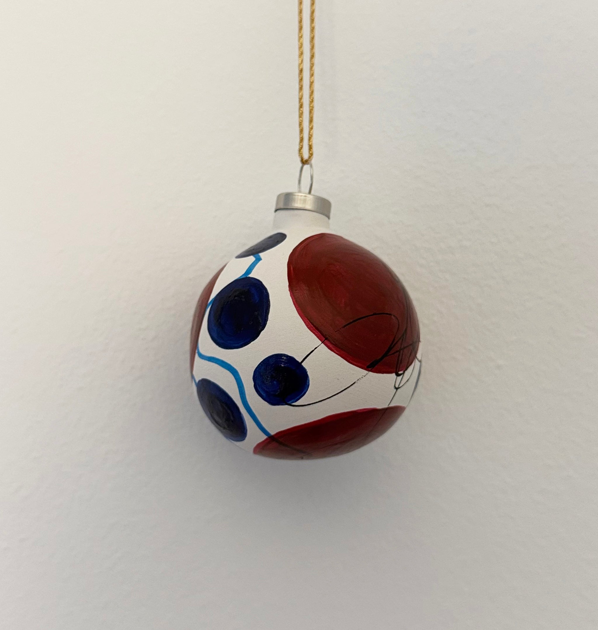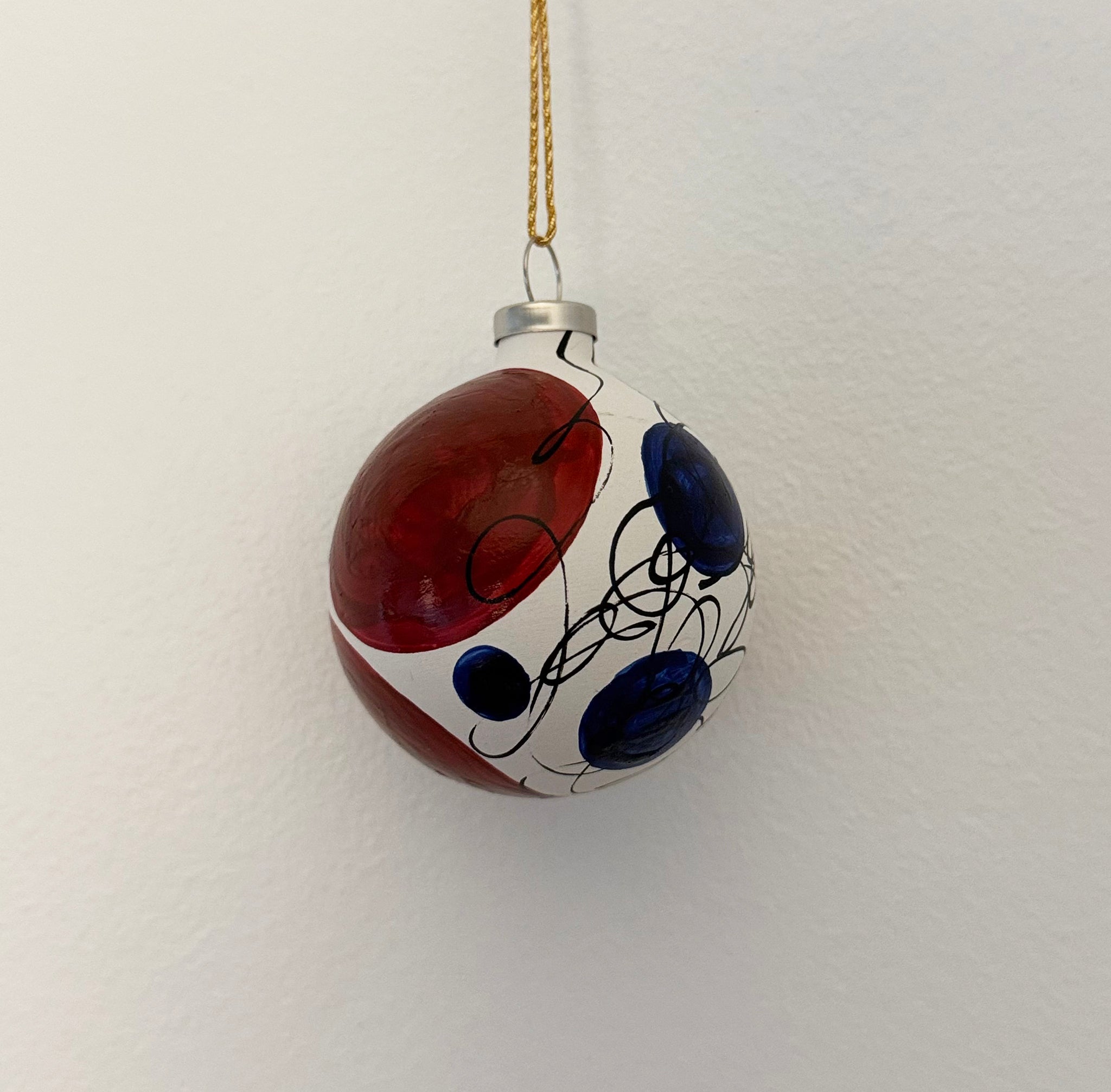 Julekugler i farvekombinationen dyb rød og blå. Små unikke kunstværker til den traditionelle juleudsmykning.