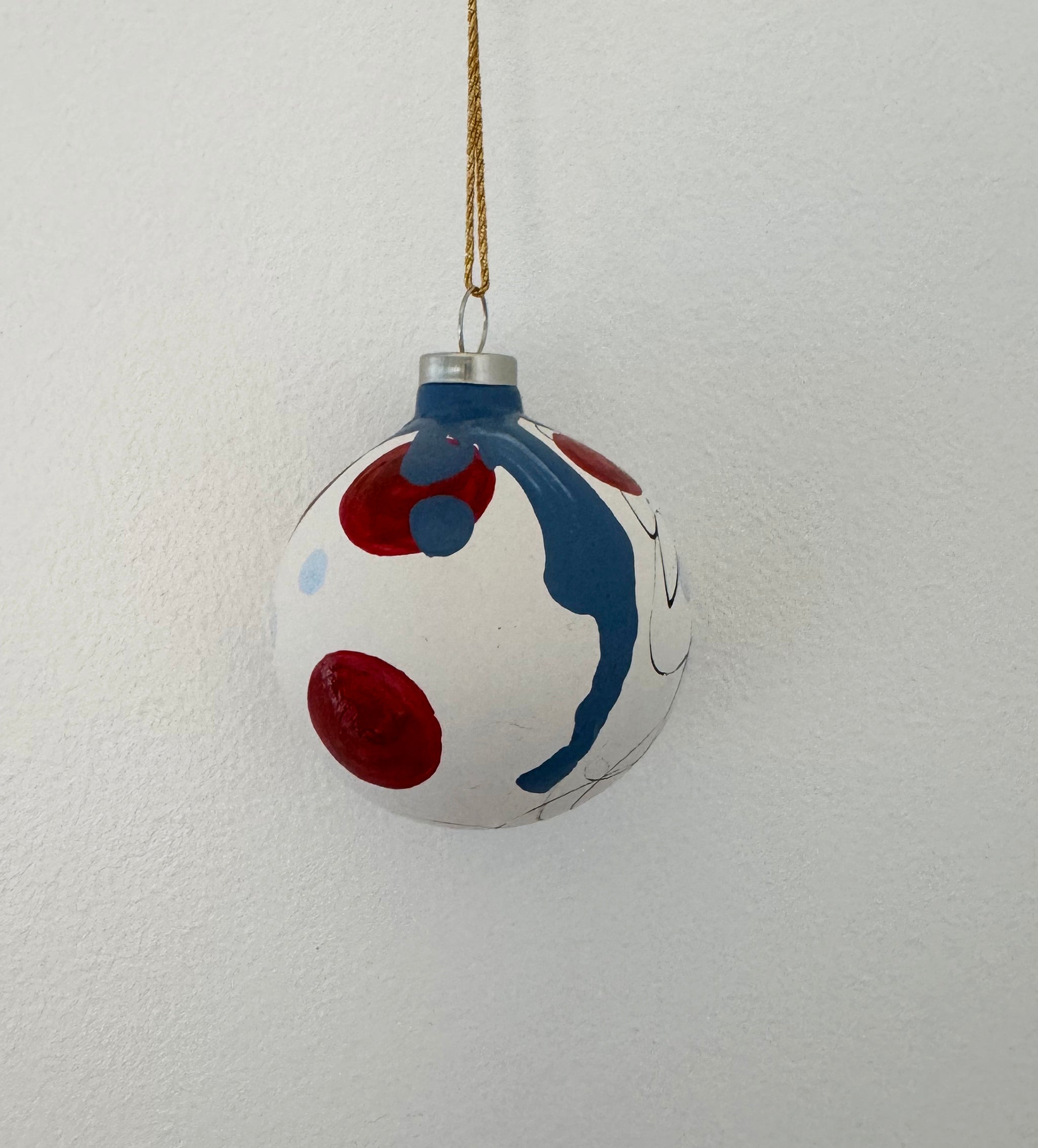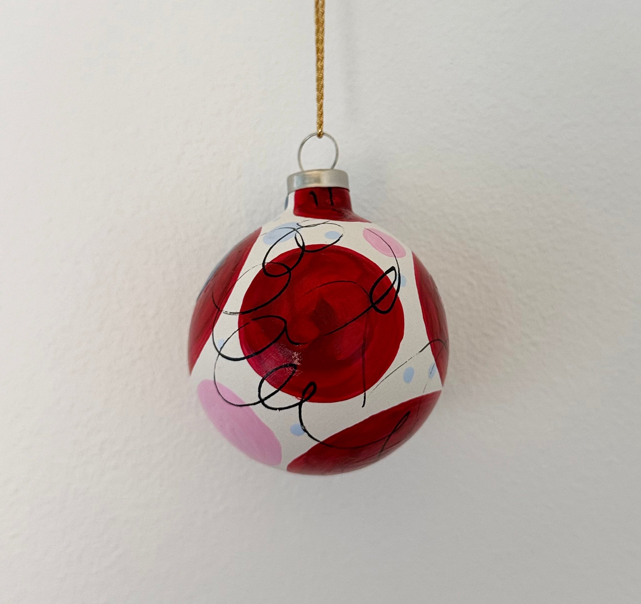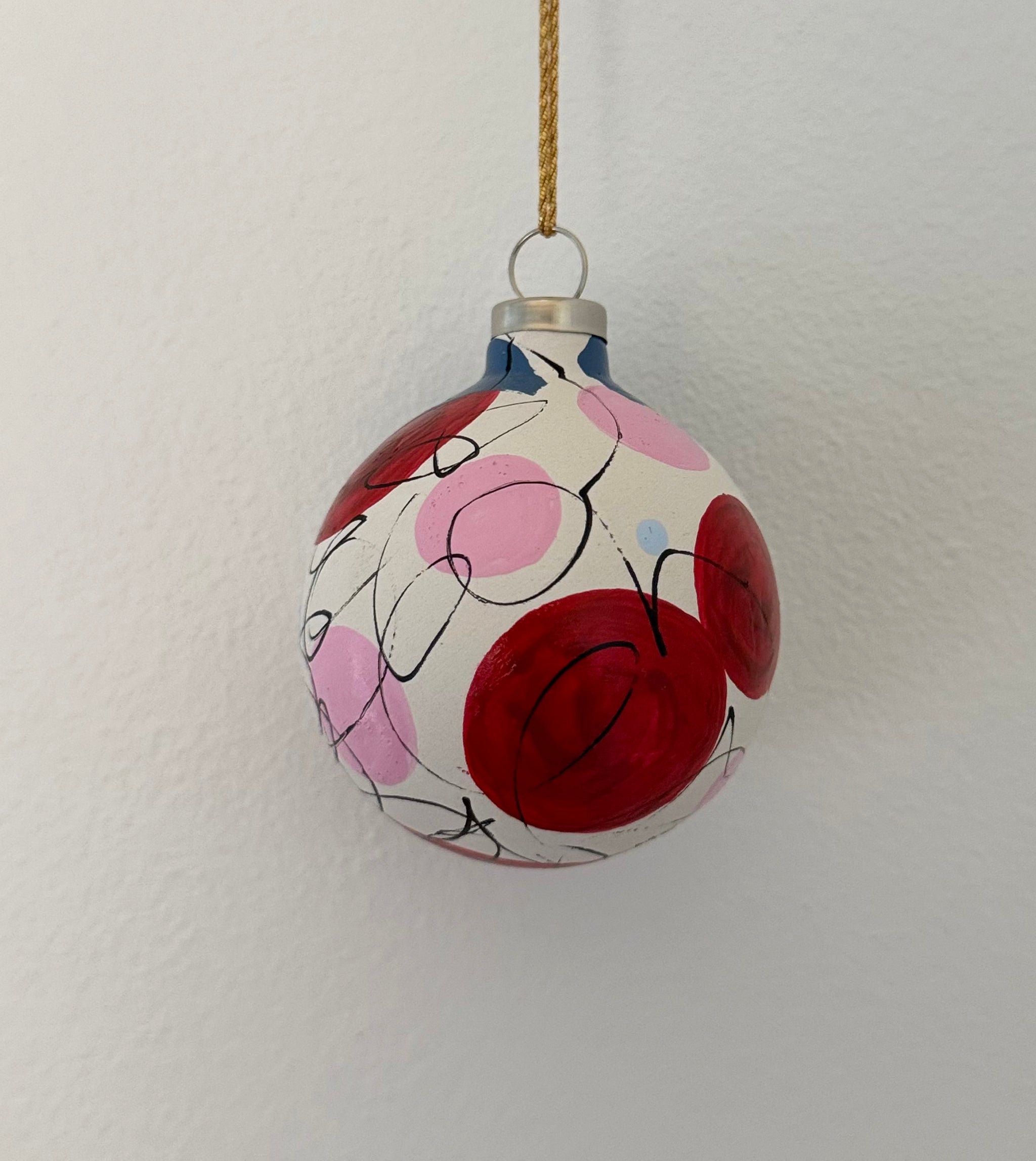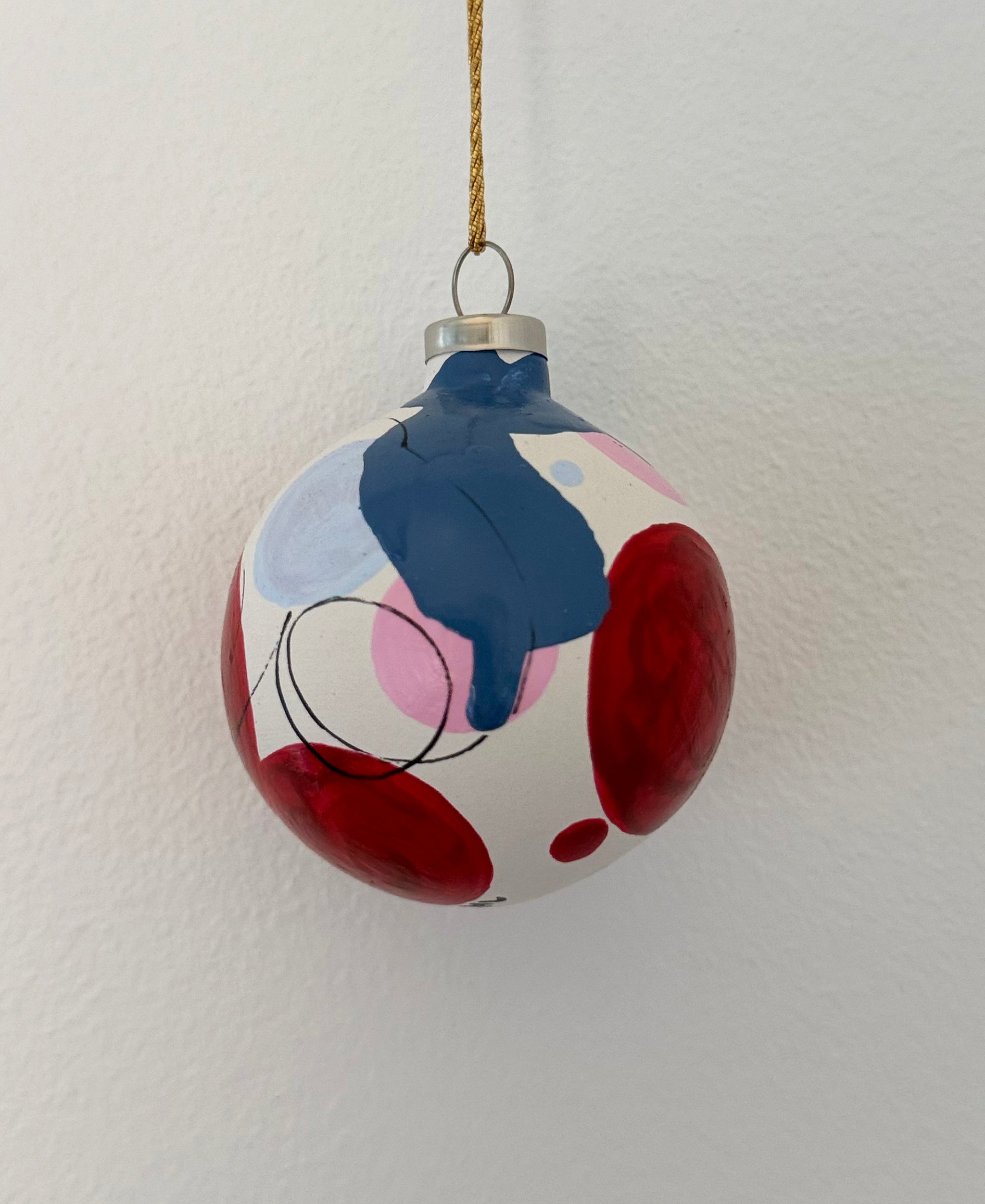 Julekugler i farvekombinationen rød, pink og blå. Små unikke kunstværker til den moderne juleudsmykning.