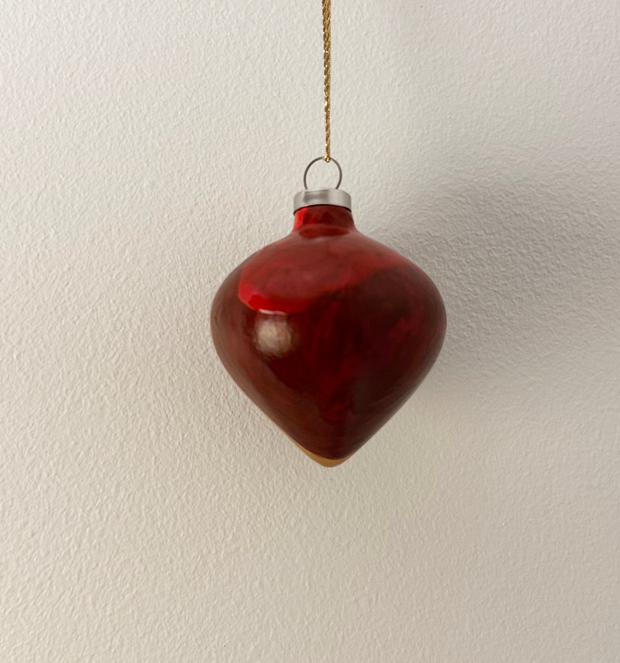 Hjerteformet julekugler der gør dit juletræ eller juleudsmykning til noget særligt i farvekombinationen dyb rød og guld.