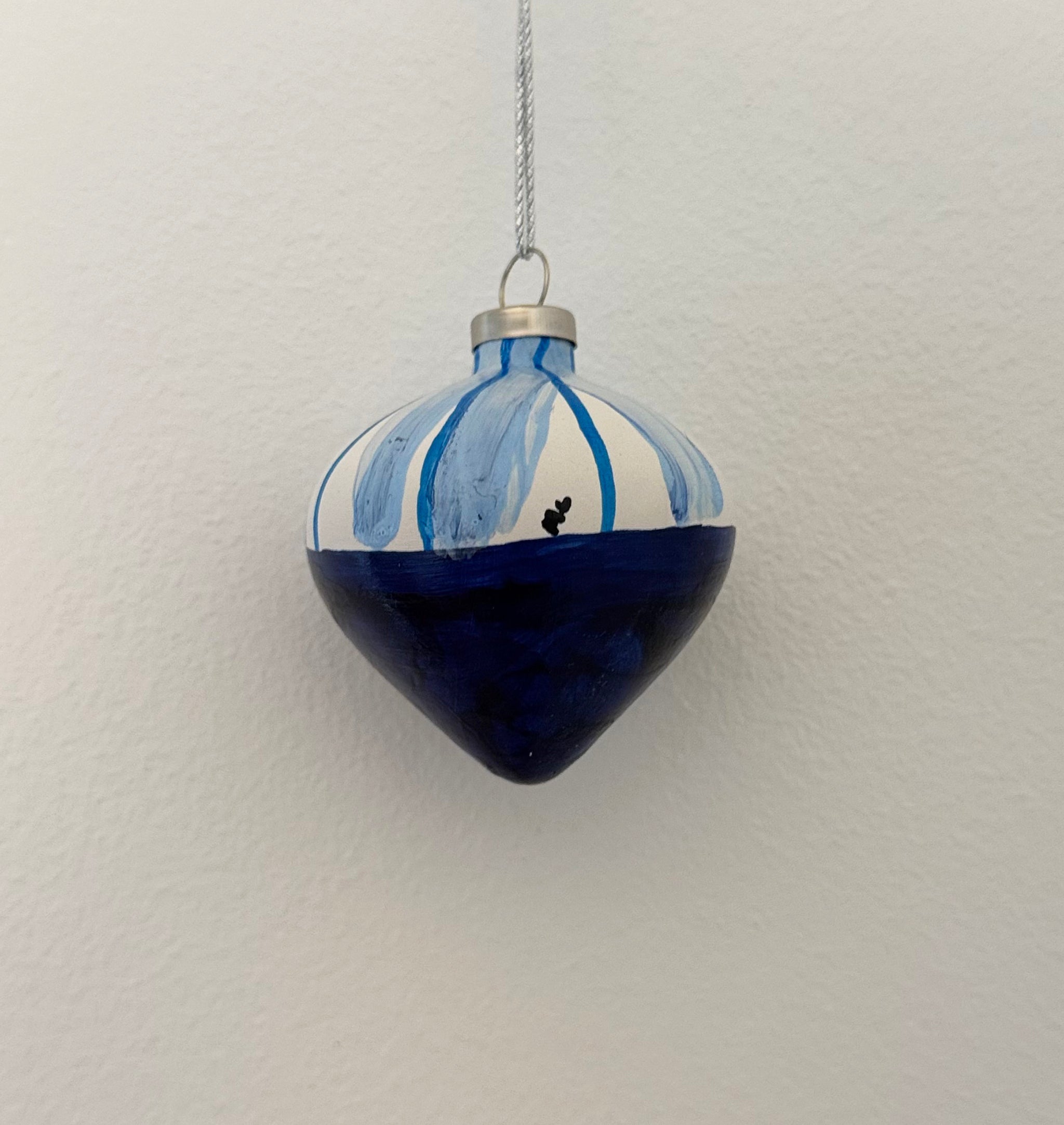 Hjerteformet julekugle i kongeblå og pastelblå gør julen eventyrlig og har en moderne effekt på juletræet. Håndmalet og unikt kunstværk.
