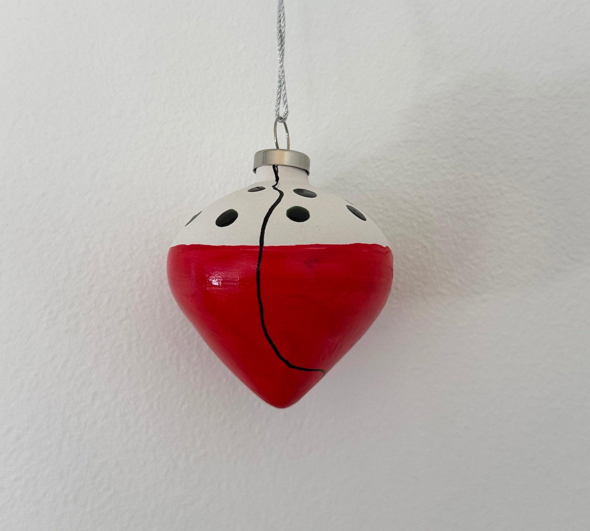 Pynt op i hjemmet med en moderne julekugle i røde og grønne nuancer og skab en varm og hyggelig atmosfære. Håndmalet unikt kunstværk til den traditionelle juleudsmykning.