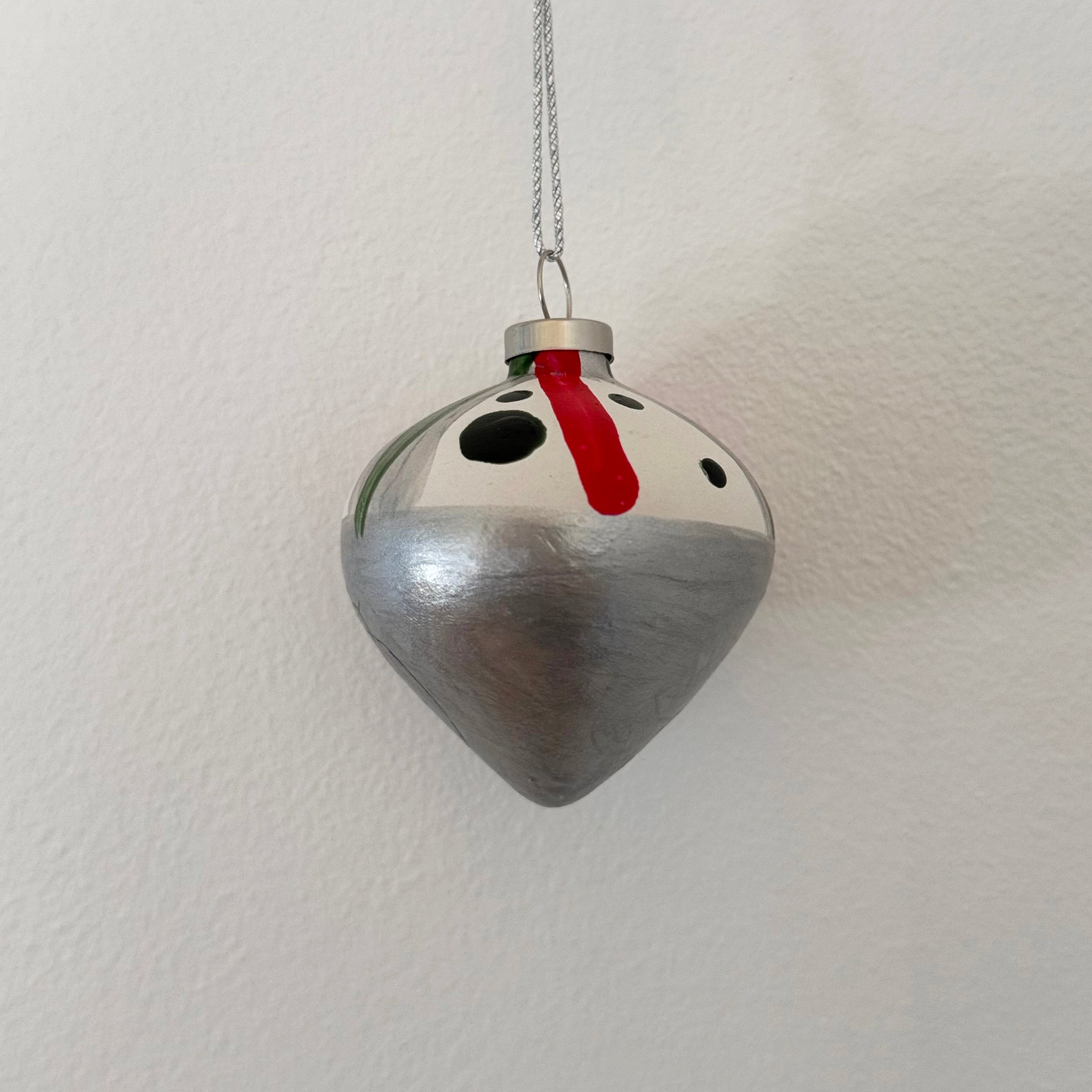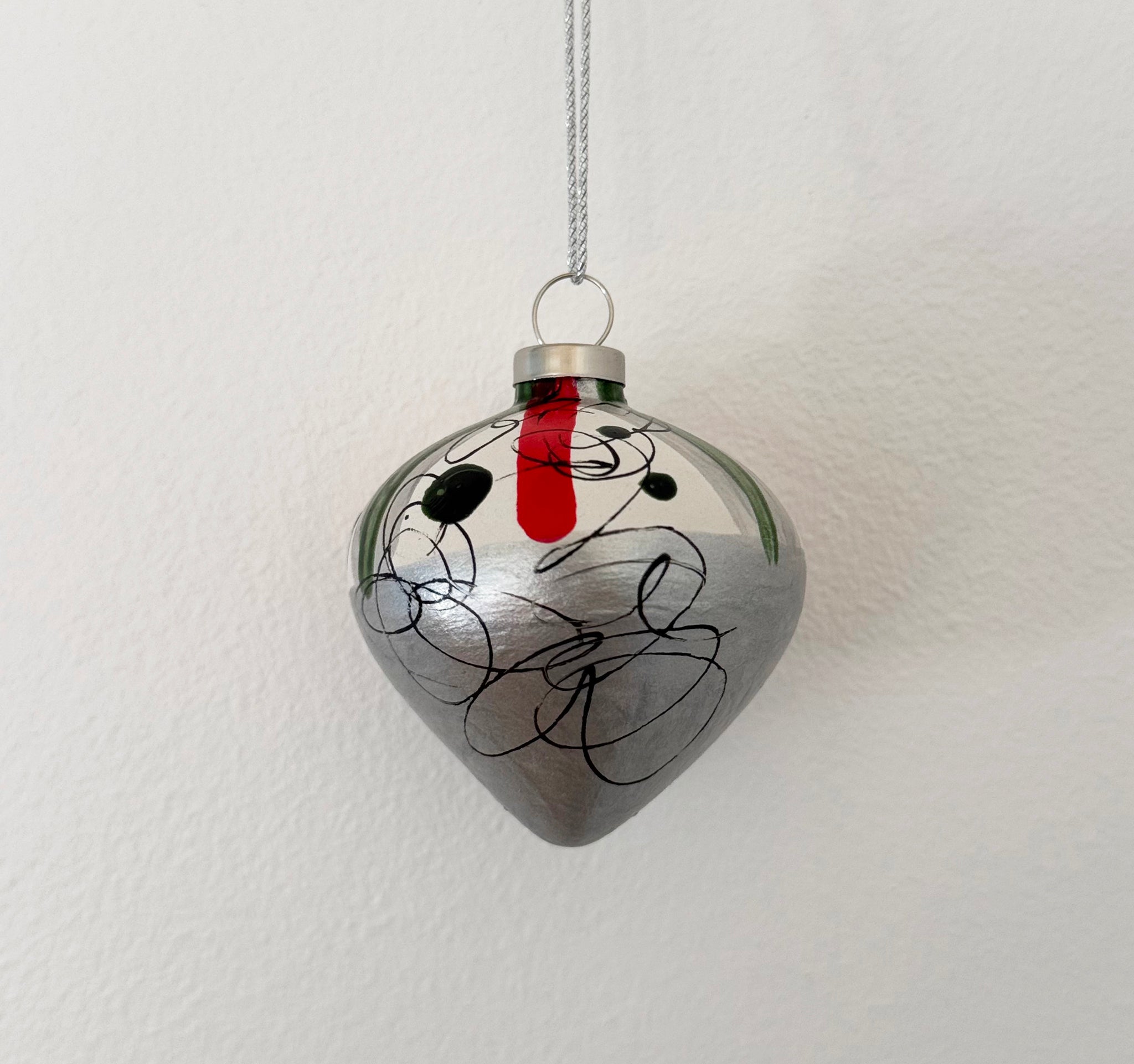 Skab magi og julestemning med med en moderne julekugle i sølv, røde og grønne nuancer. Hjerteformet og unik julekugle malet i hånden.