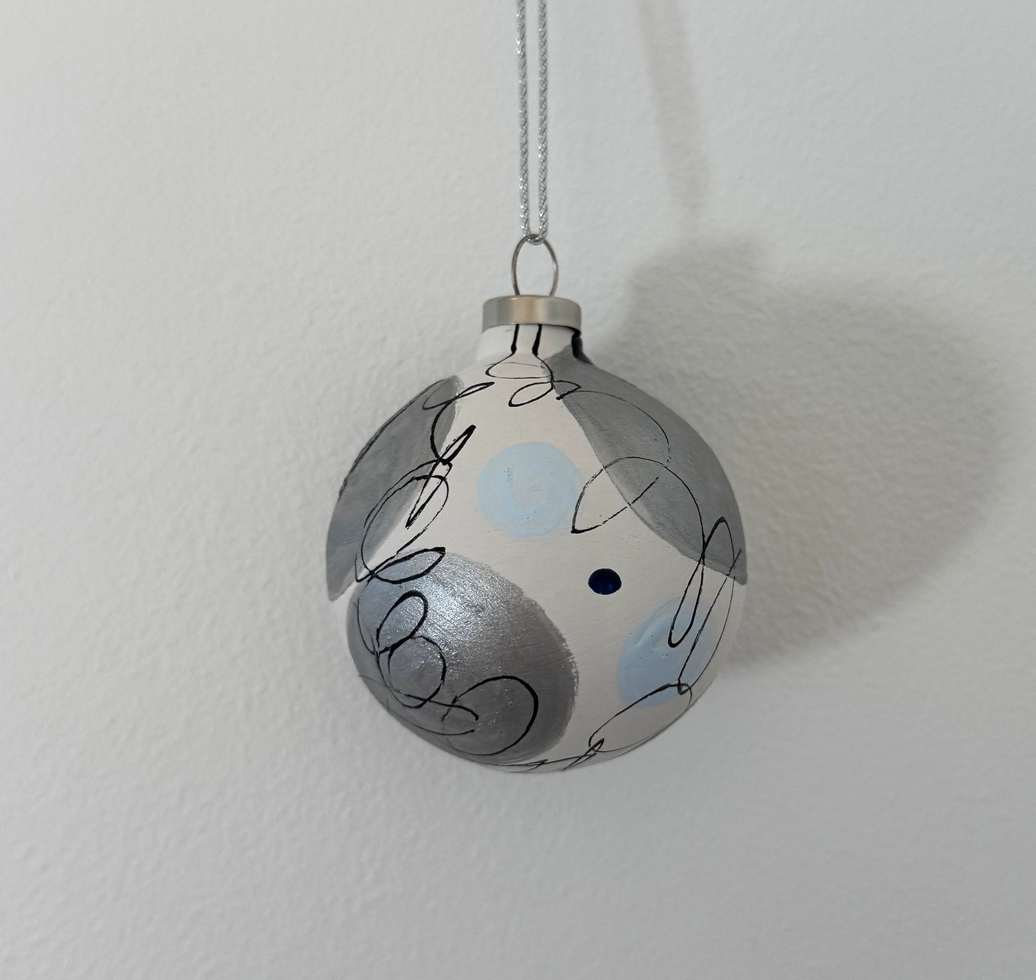 Skab magi og julestemning med med en moderne rund julekugle i sølv og pastelblå. Unik julekugle malet i hånden.