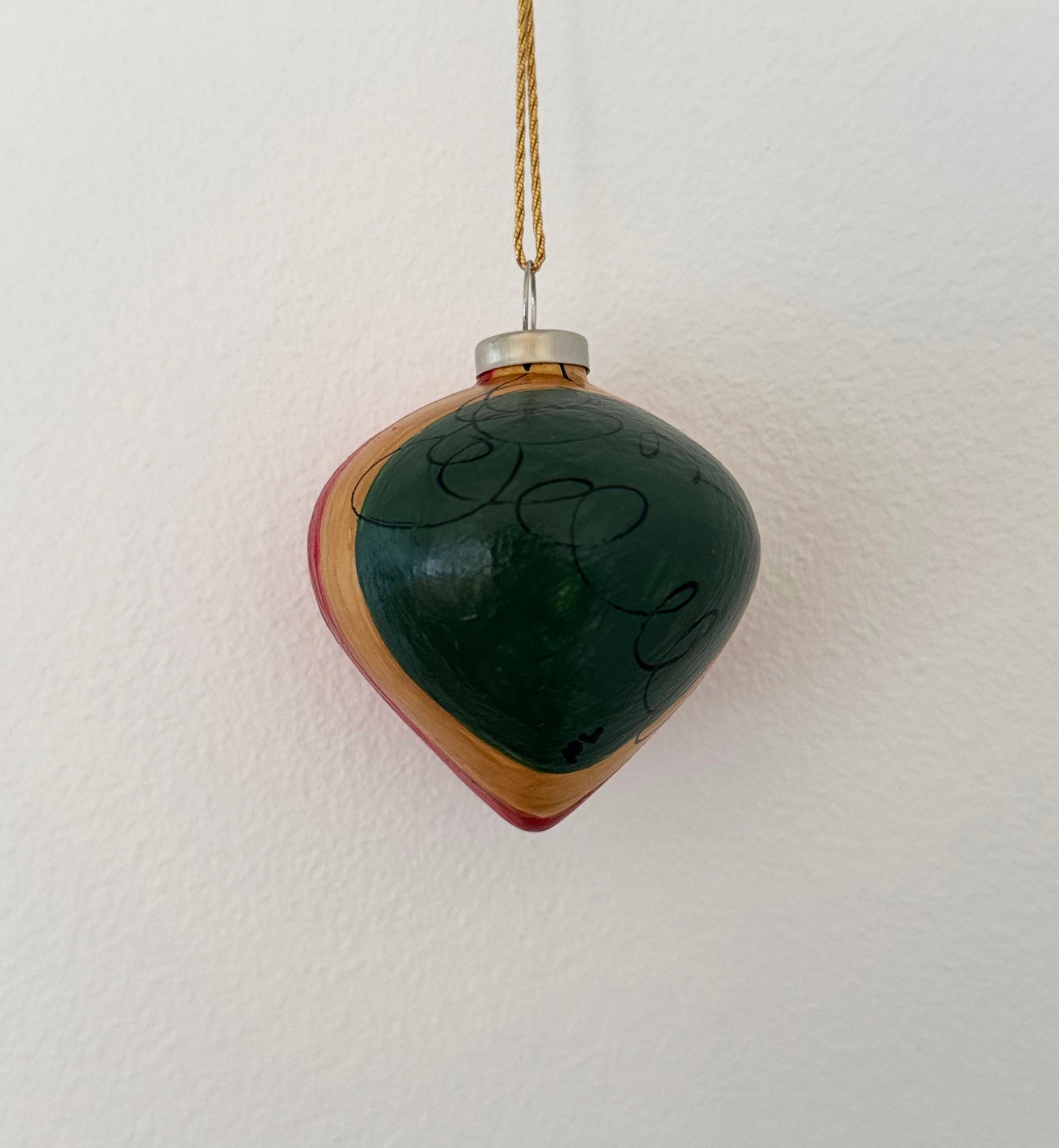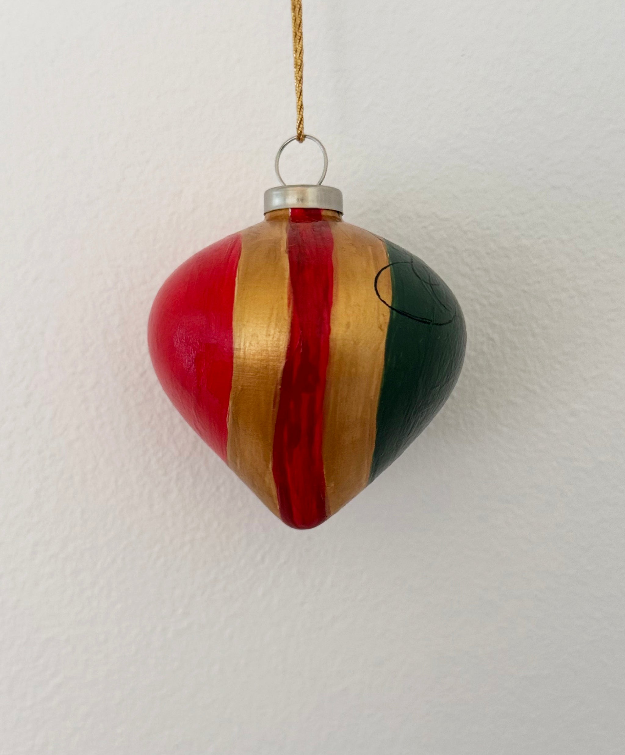 Hjerteformet julekugle der gør dit juletræ eller juleudsmykning til noget særligt i farvekombinationen dyb rød, grøn og guld.