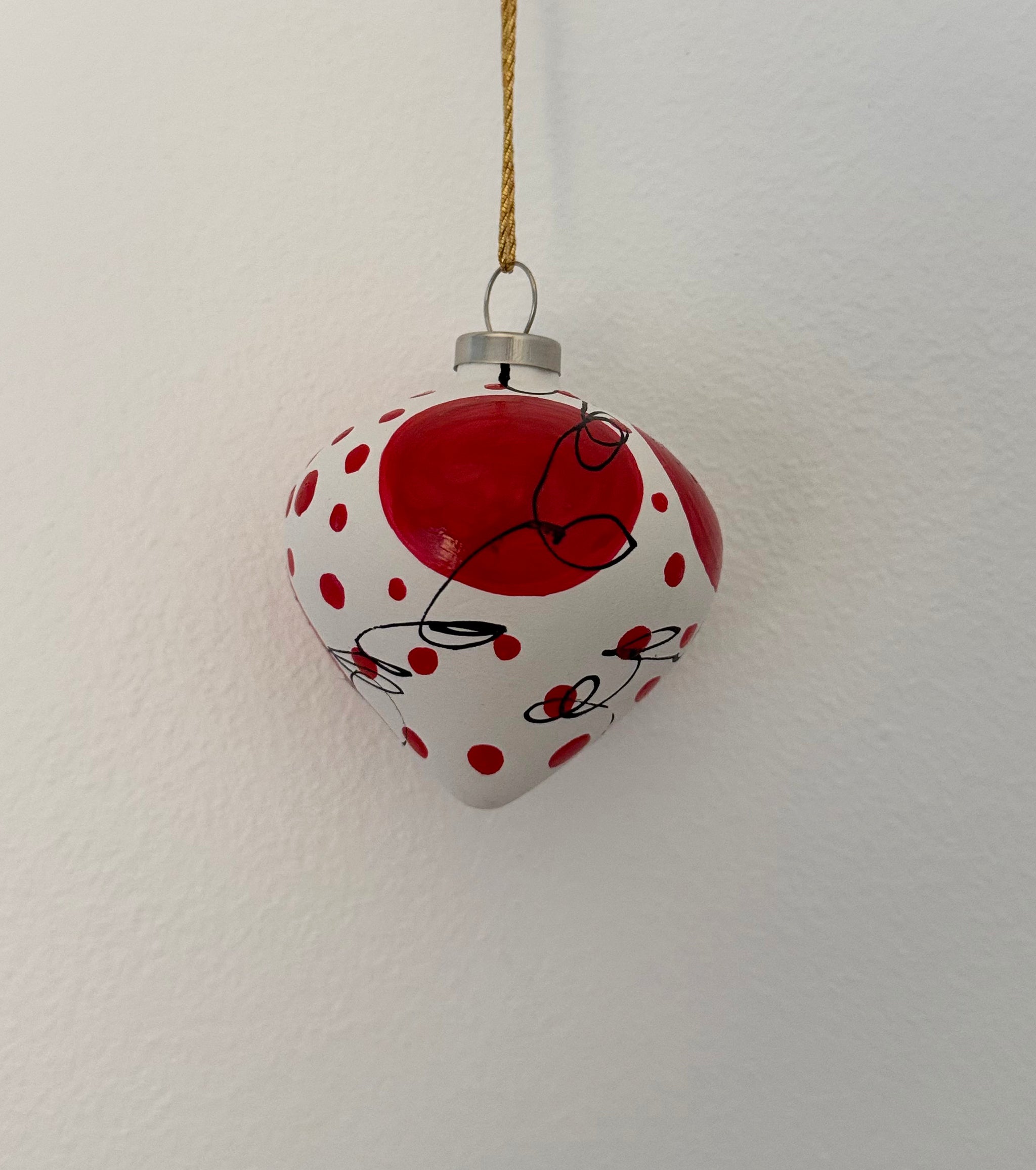 Pynt op i hjemmet med en moderne julekugle i røde nuancer og skab en varm og hyggelig atmosfære. Håndmalet unikt kunstværk til den traditionelle juleudsmykning.