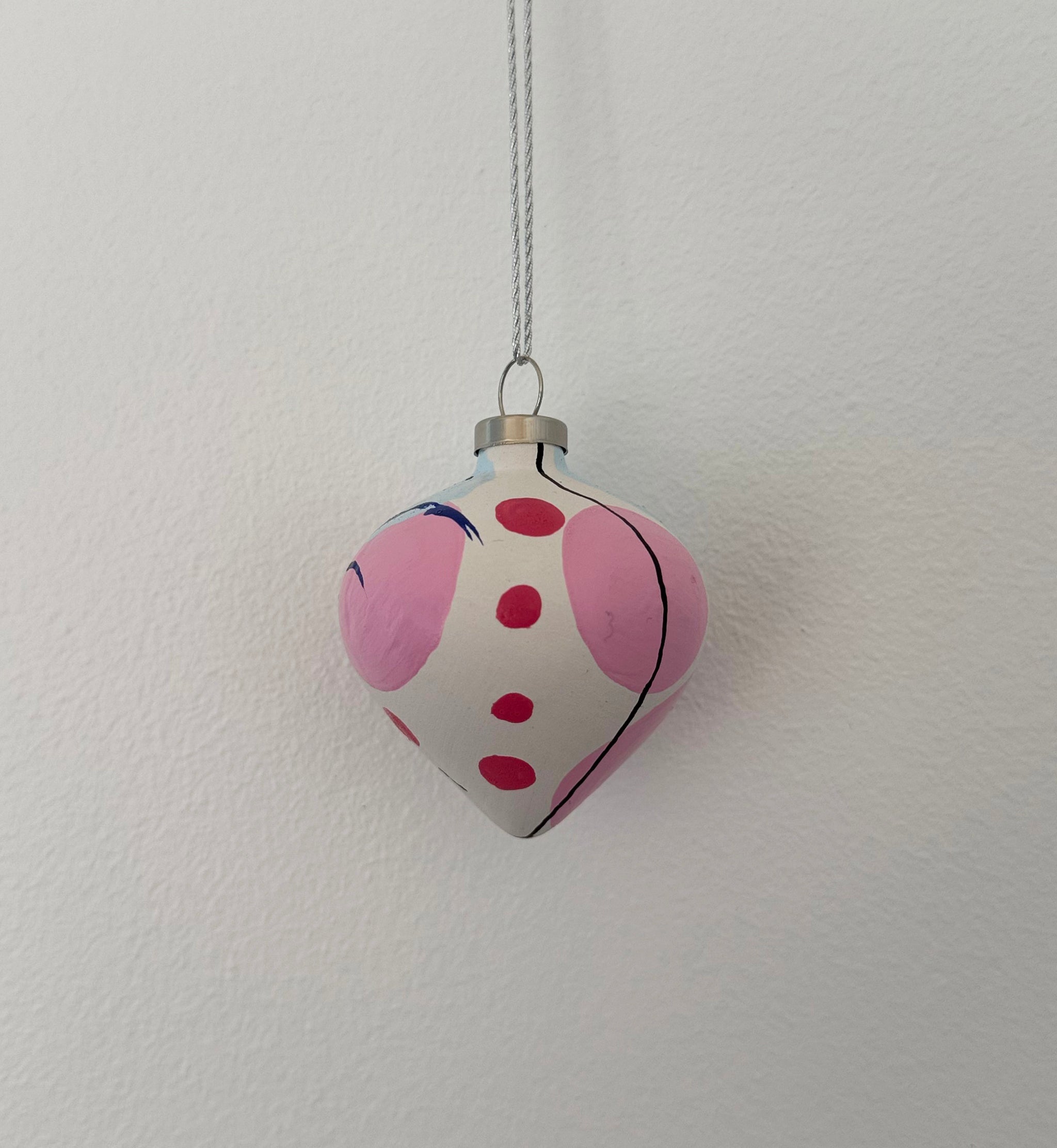 Lyserød og blå julekugle der tilføjer juletræet et harmonisk udtryk. Den lyserøde farve tilføjer varme og energi og den blå farve tilføjer en kølig og beroligende effekt. Julekuglen er håndmalet og i keramik.