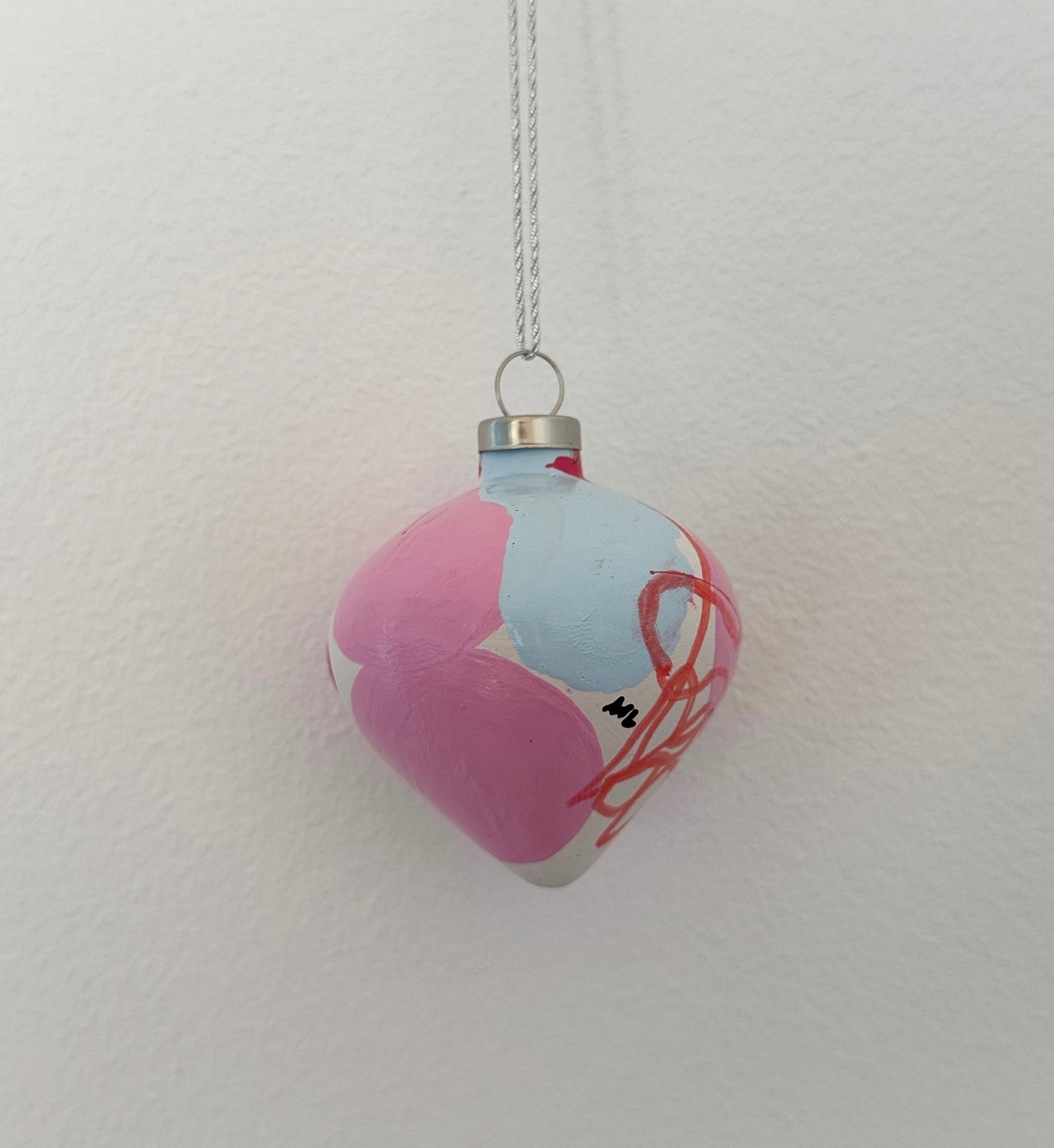 Lyserød og blå julekugle der tilføjer juletræet et harmonisk udtryk. Den lyserøde farve tilføjer varme og energi og den blå farve tilføjer en kølig og beroligende effekt. Julekuglen er håndmalet og i keramik.