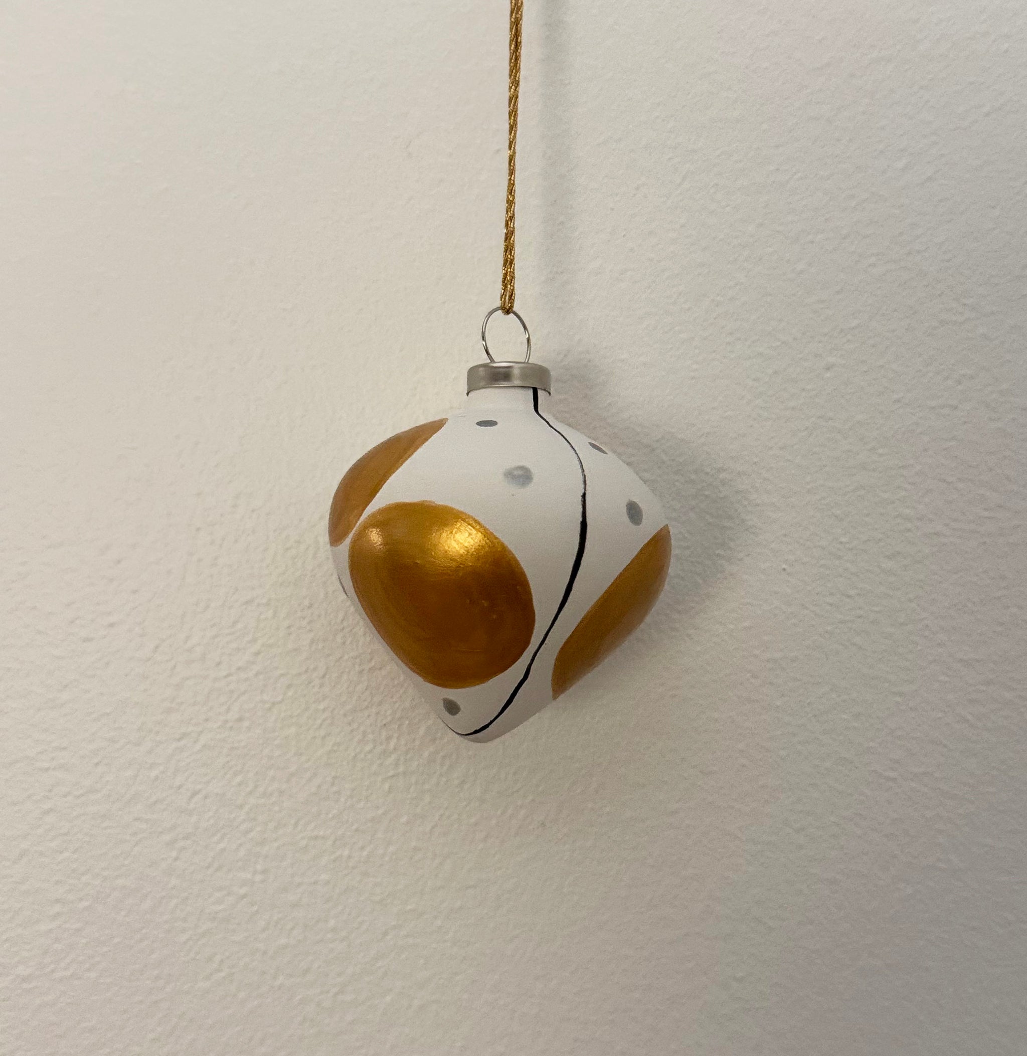 Skab magi og julestemning med med en moderne julekugle i guld og sølv. Unik julekugle malet i hånden og i hjerteformet lertøj. Nr. 163