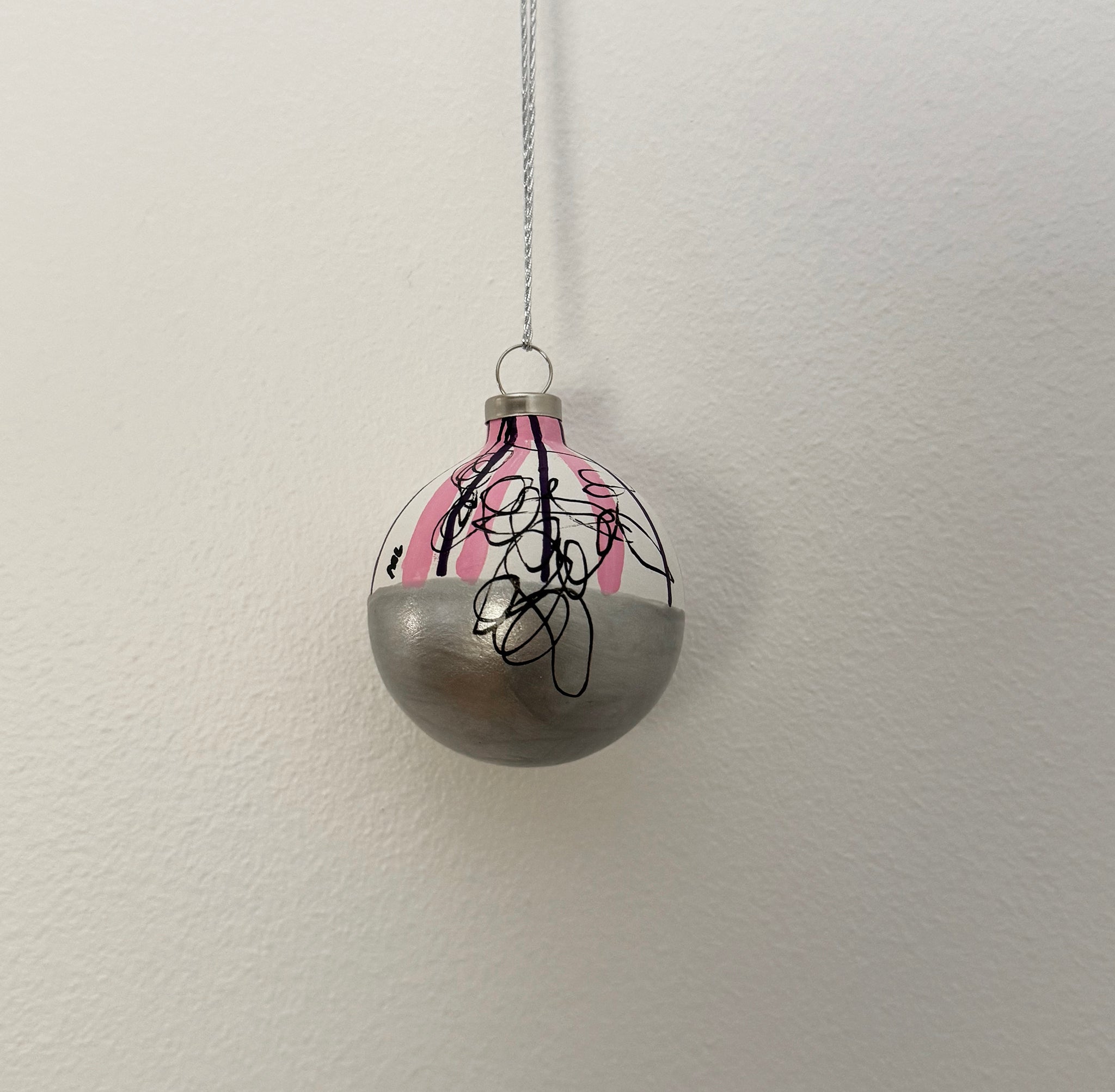 Rund julekugle i sølv og trendy pink. Unik julekugle malet i hånden.