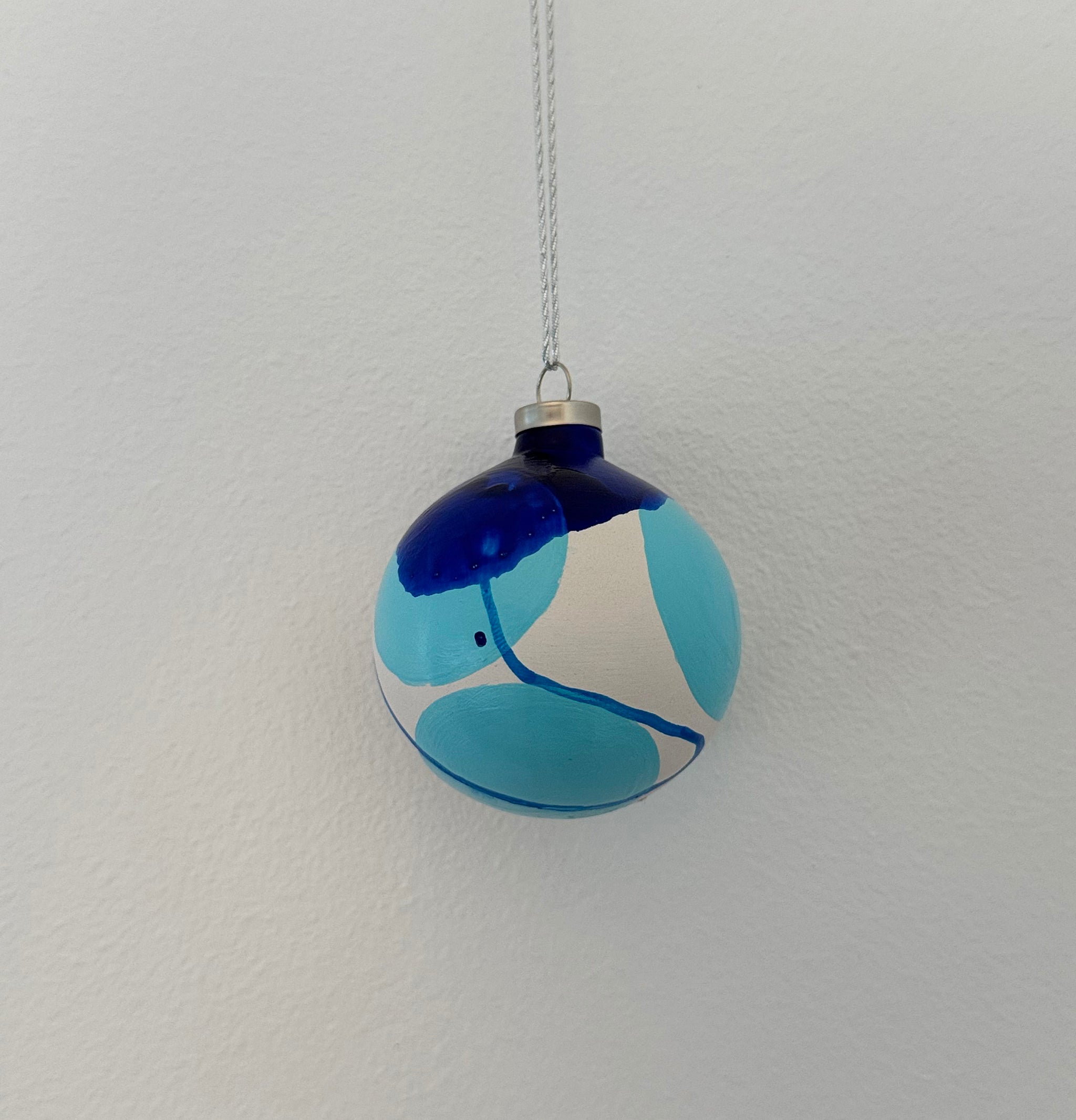 Skab magi og julestemning med med en moderne rund julekugle i sølv og blå. Unik julekugle malet i hånden og i lertøj.