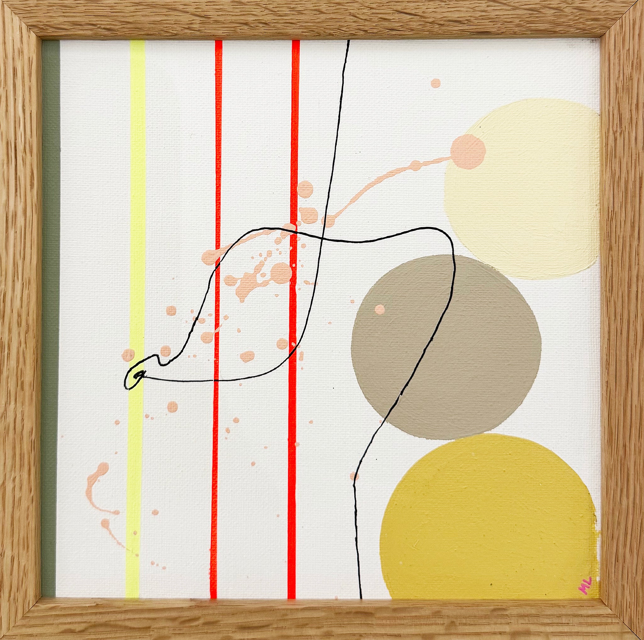 Håndmalet maleri på lærred sat i en ramme af egefinér med glas. Stilarten er moderne og har et grafisk udtryk med svævende bløde former, der gør maleriet levende og skaber en poetisk stemning.