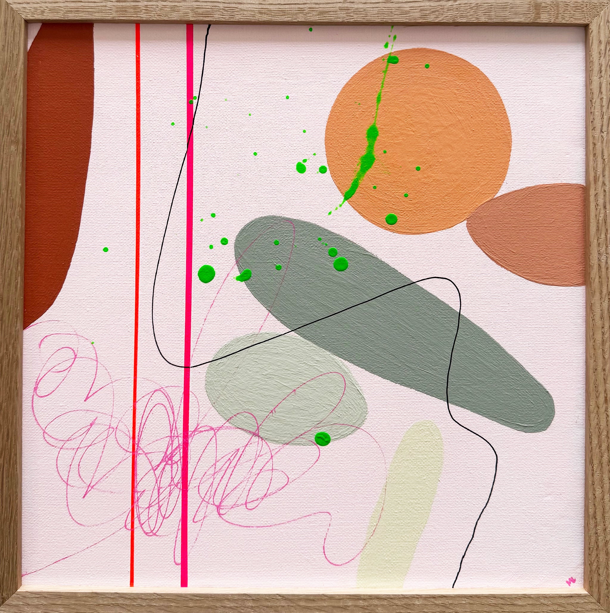 Håndmalet maleri i ramme af egefinér med glas. Stilarten er moderne og har et grafisk udtryk med svævende bløde former, der gør maleriet levende og skaber en poetisk stemning.