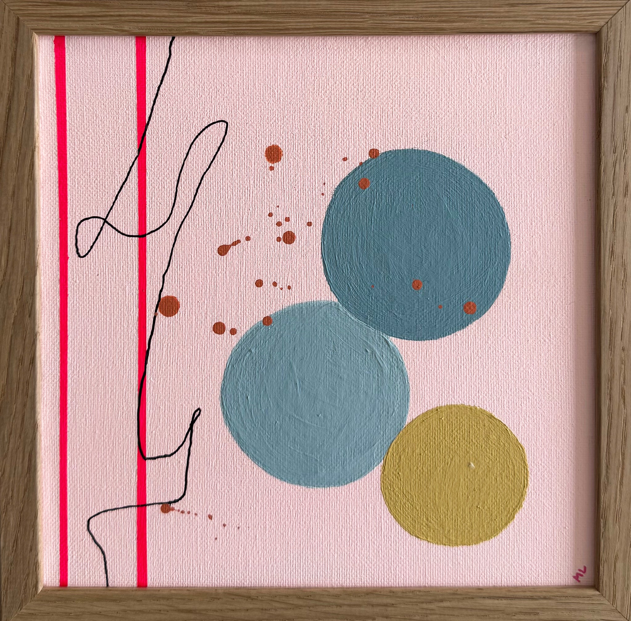 Håndmalet maleri i ramme af egefinér med glas. Stilarten er moderne og har et grafisk udtryk med svævende bløde former, der gør maleriet levende og skaber en poetisk stemning.