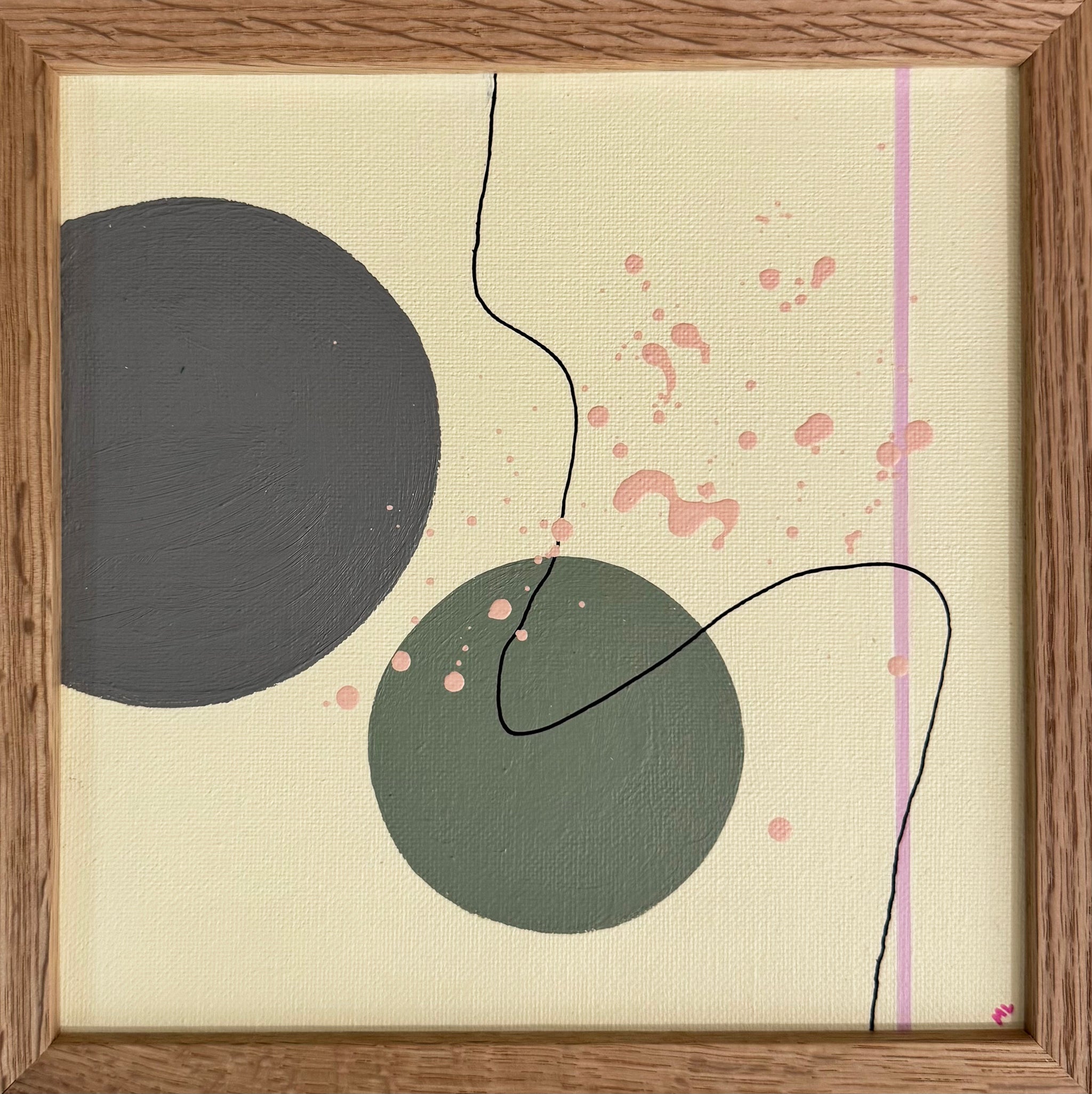 Håndmalet maleri på lærred sat i en ramme af egefinér med glas. Stilarten er moderne og har et grafisk udtryk med svævende bløde former, der gør maleriet levende og skaber en poetisk stemning.